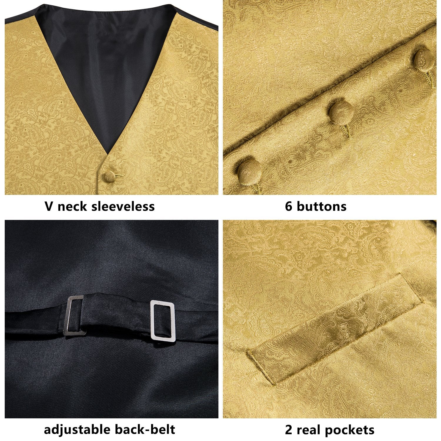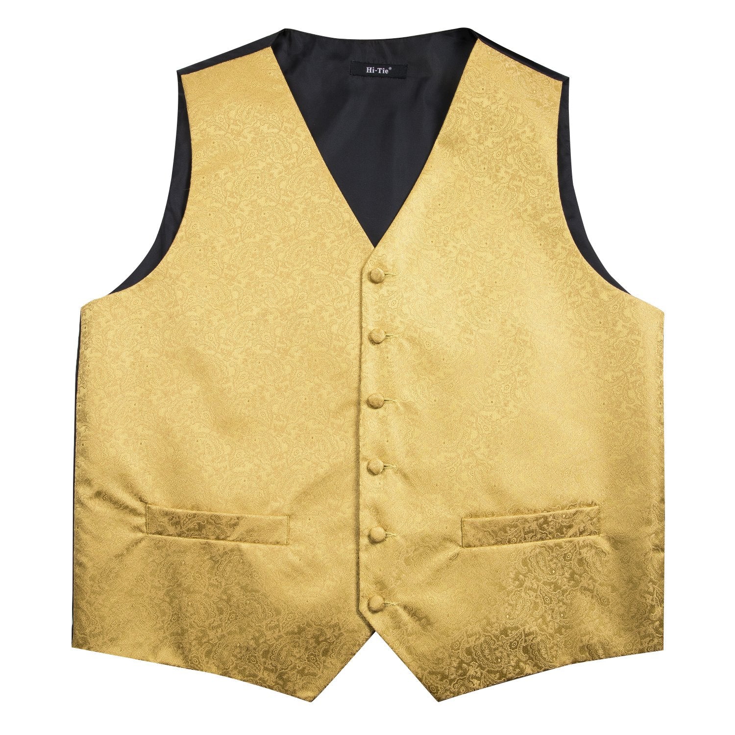 Hi-Tie Luxury Pure Golden Paisley Jacquard Silk Men's Vest Hanky Cufflinks Tie Set Waistcoat Suit Set