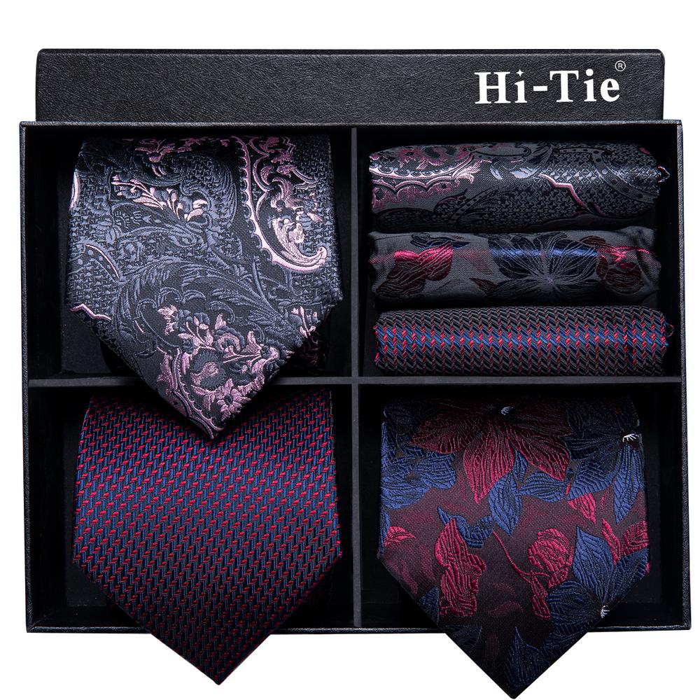Luxury Red Black Floral Tie Pocket Square Cufflinks Gift Box Set