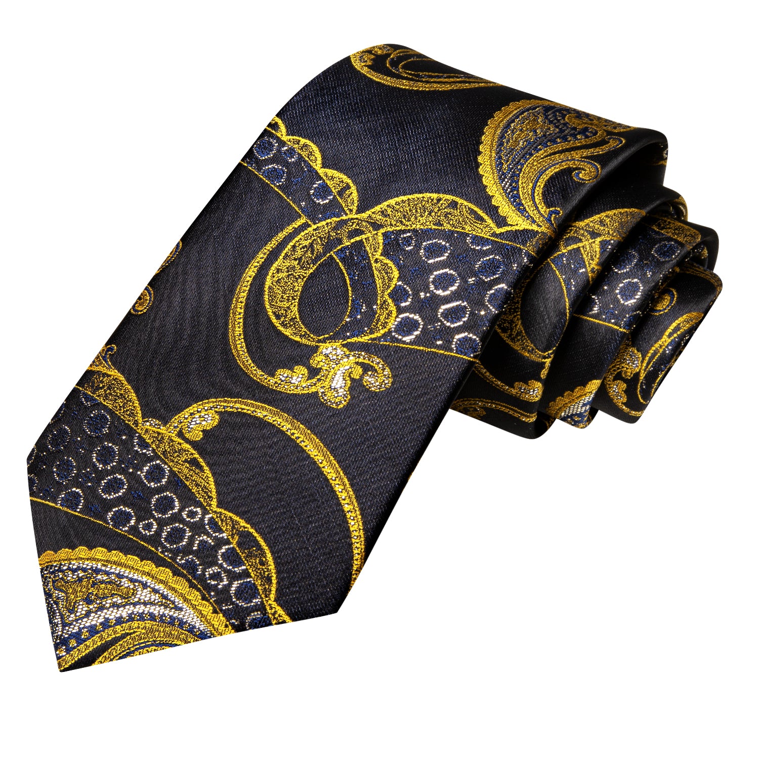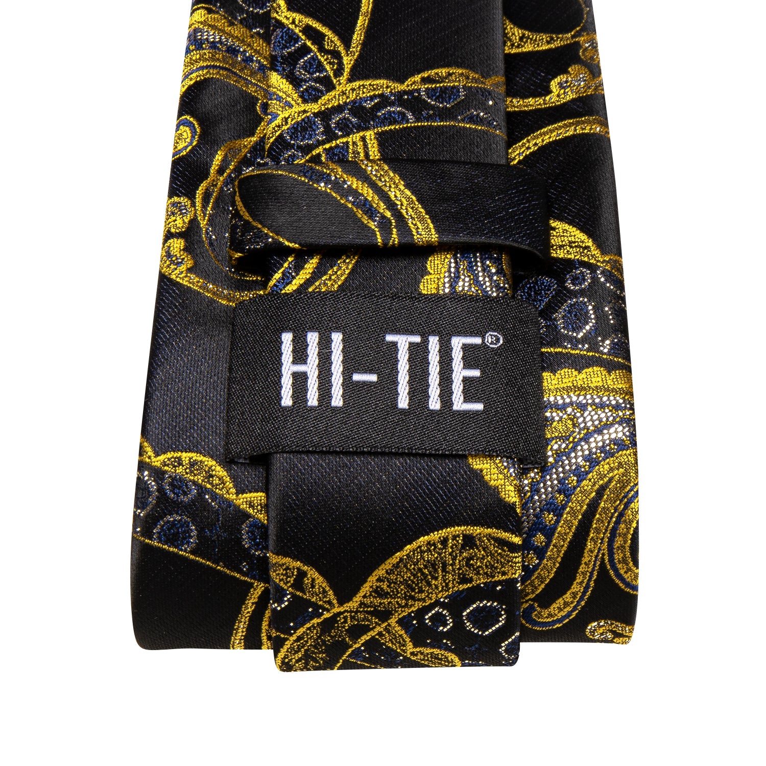 Hi-Tie Black Golden Blue Floral Necktie Pocket Square Cufflinks Set