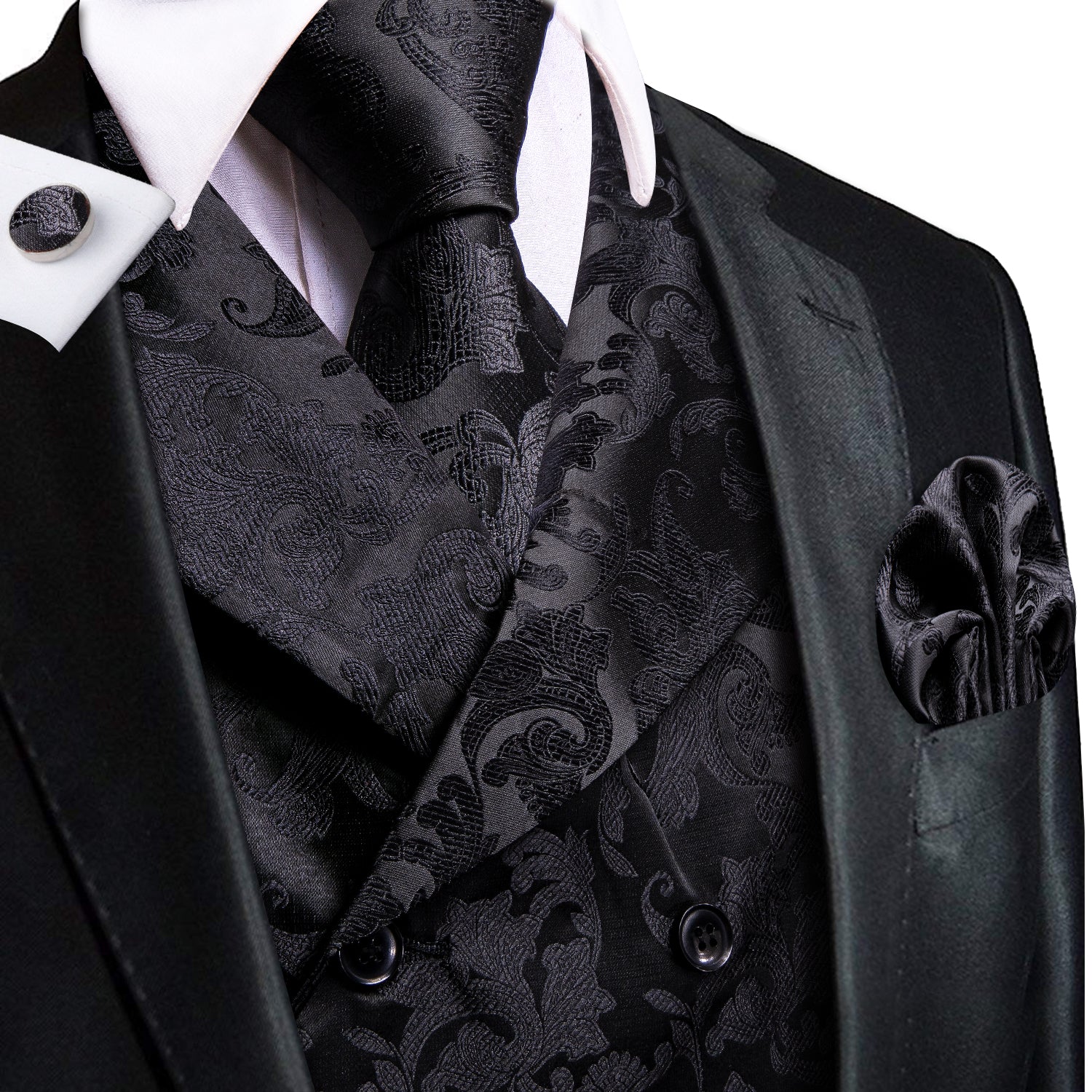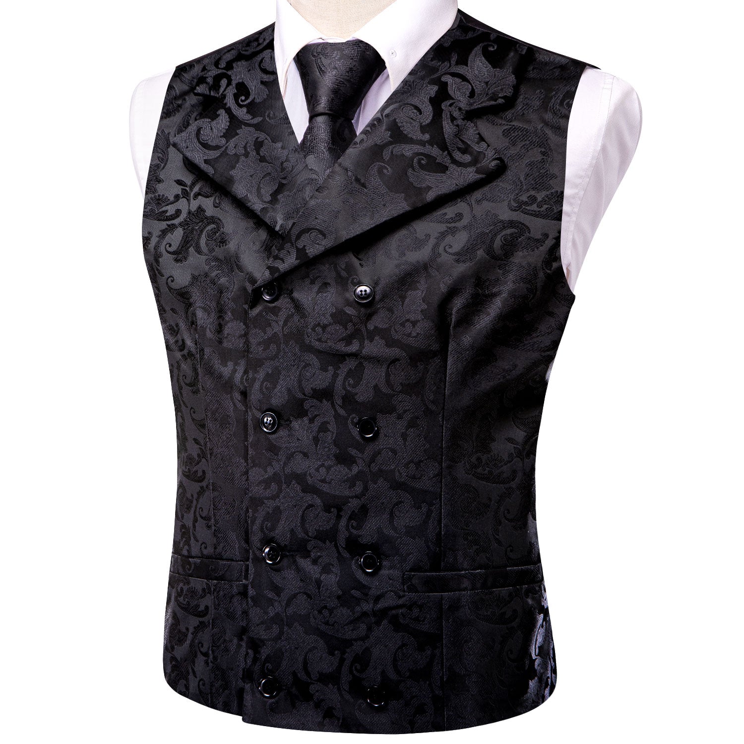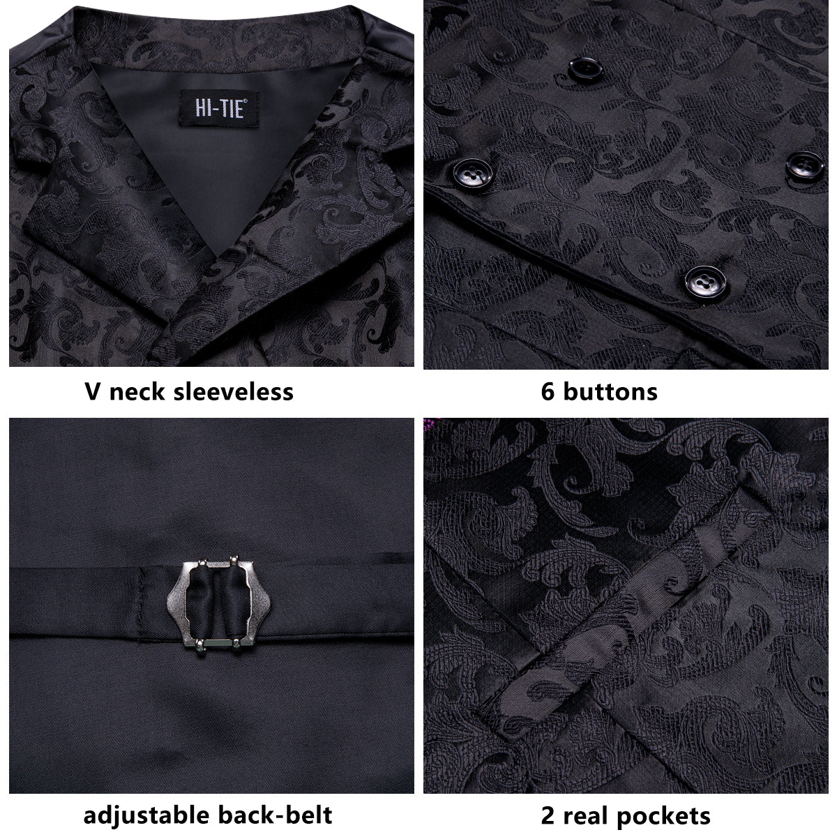 Hi-Tie Double Breasted Waistcoat Black Paisley Men's Formal Vest Tie Set