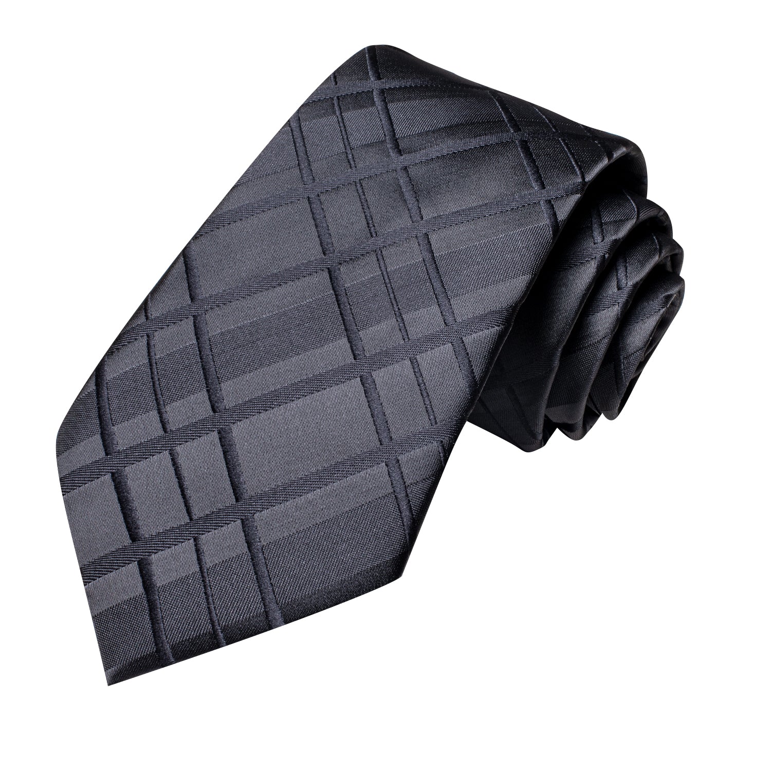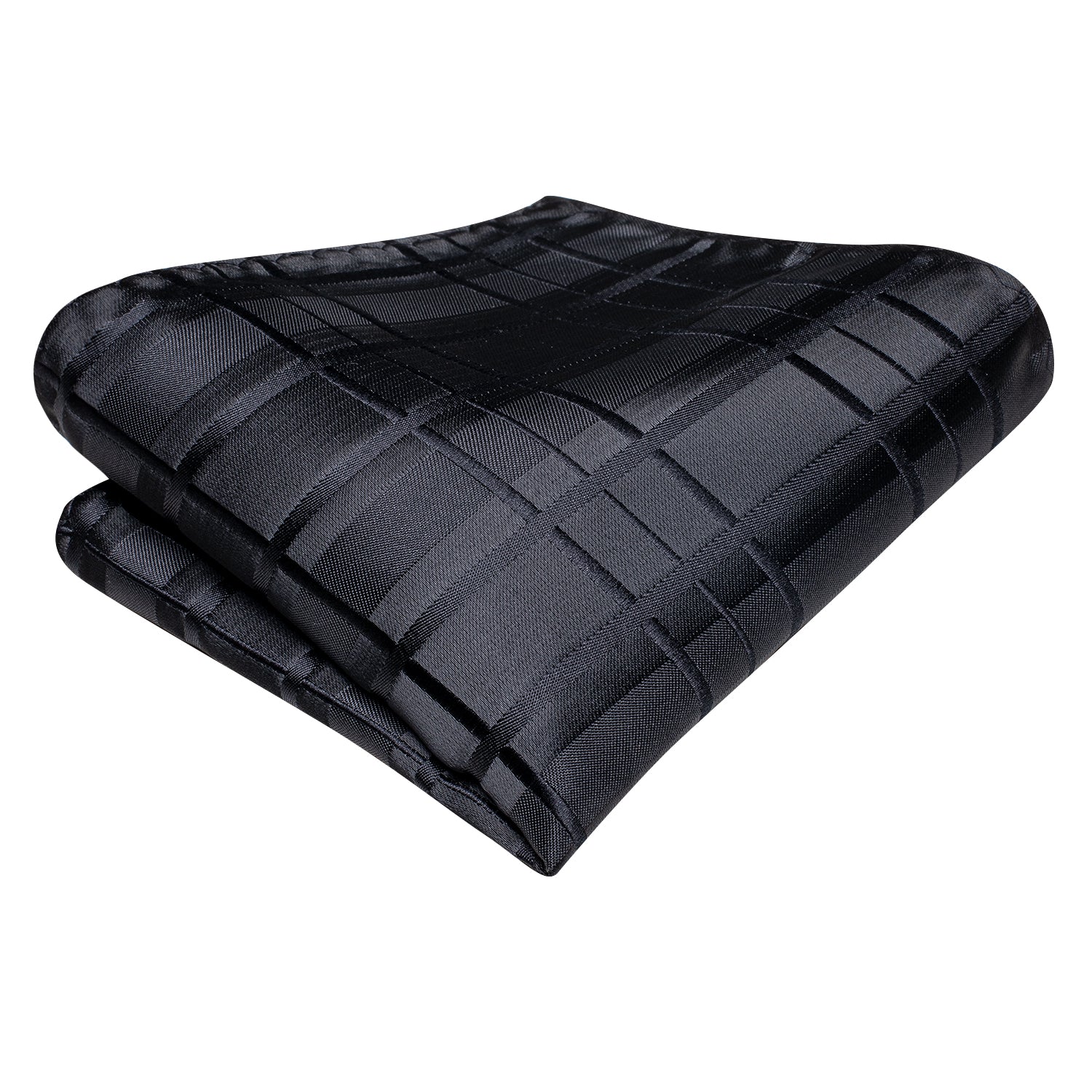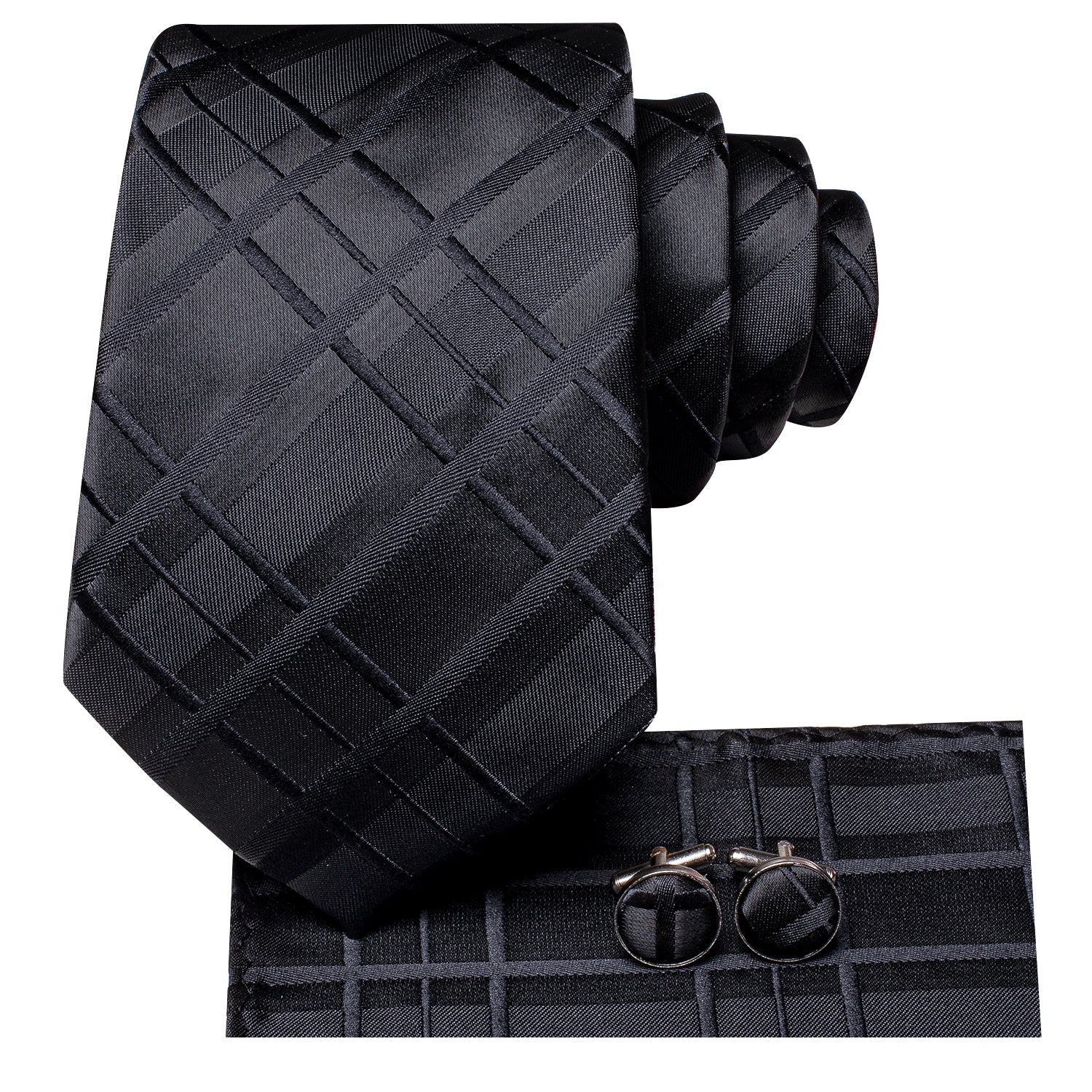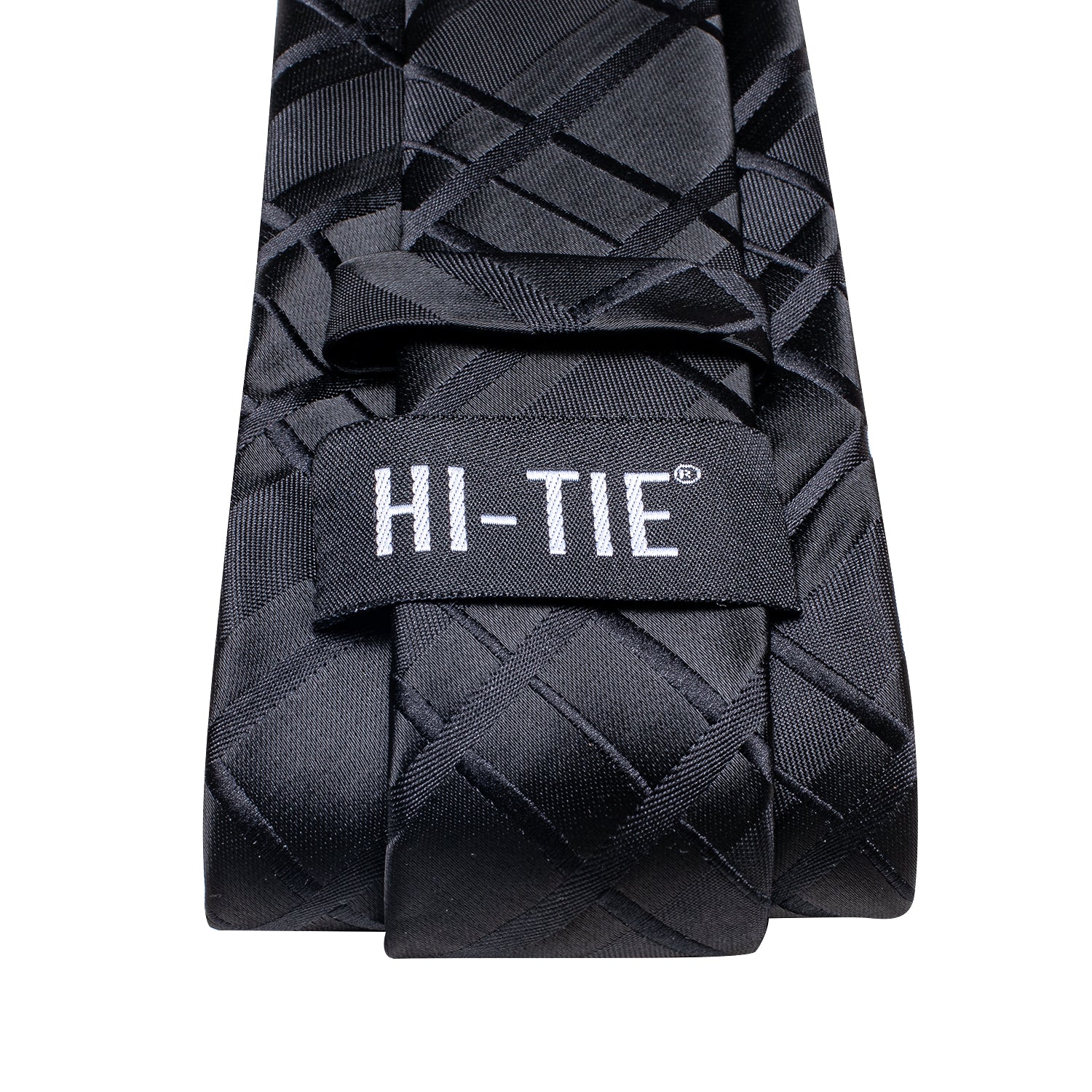 Hi-Tie Black Wedding Tie Plaid Men Necktie Pocket Square Cufflinks Set