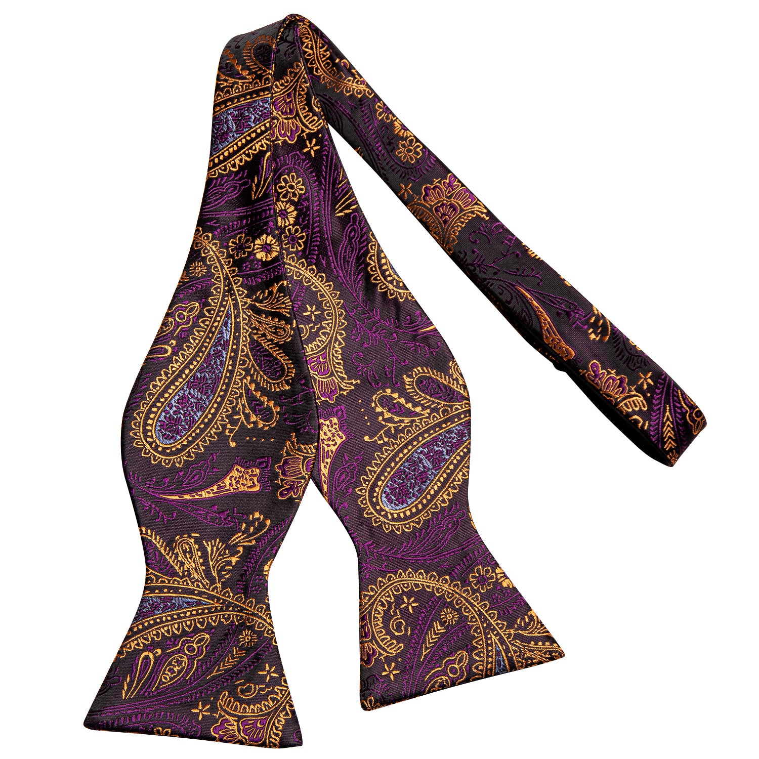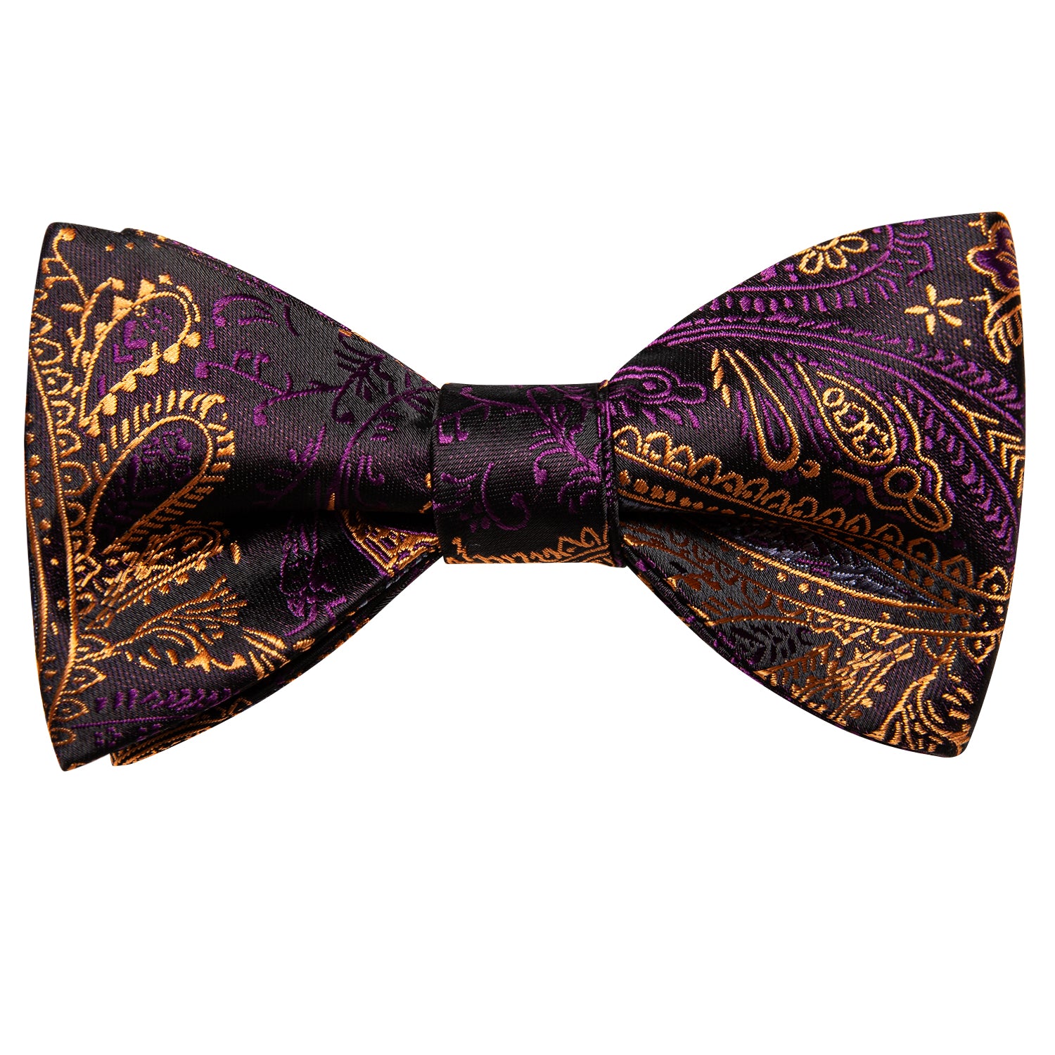 Hi-Tie Purple Tie Golden Paisley Self-tied Bow Tie Hanky Cufflinks Set