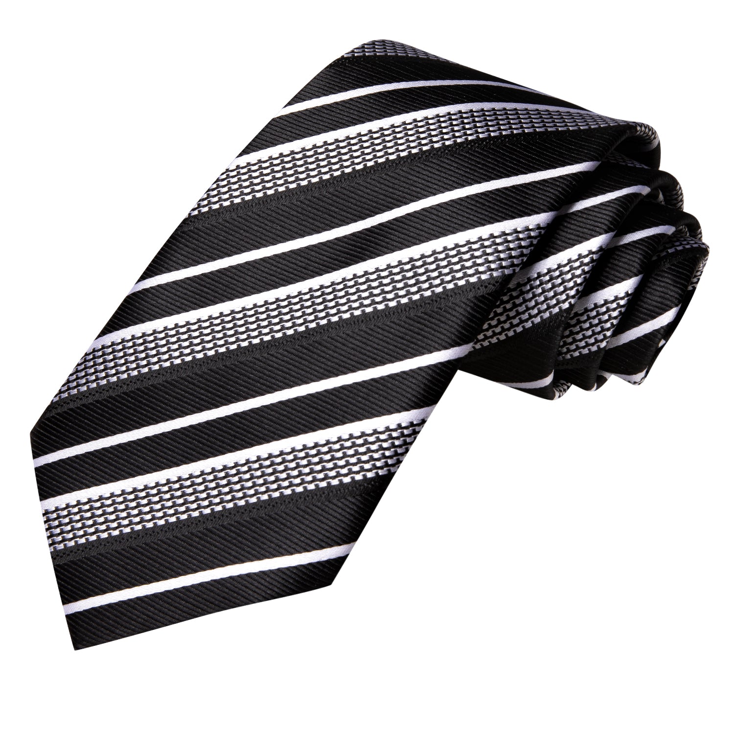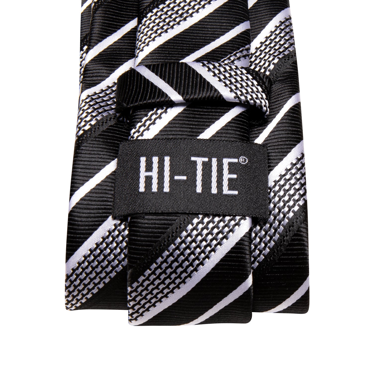 Hi-Tie Men's Black White Striped Necktie Pocket Square Cufflinks Set
