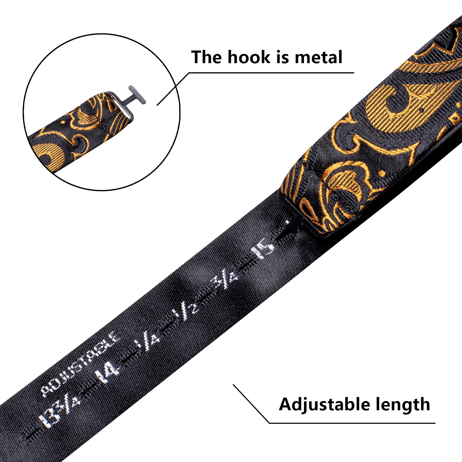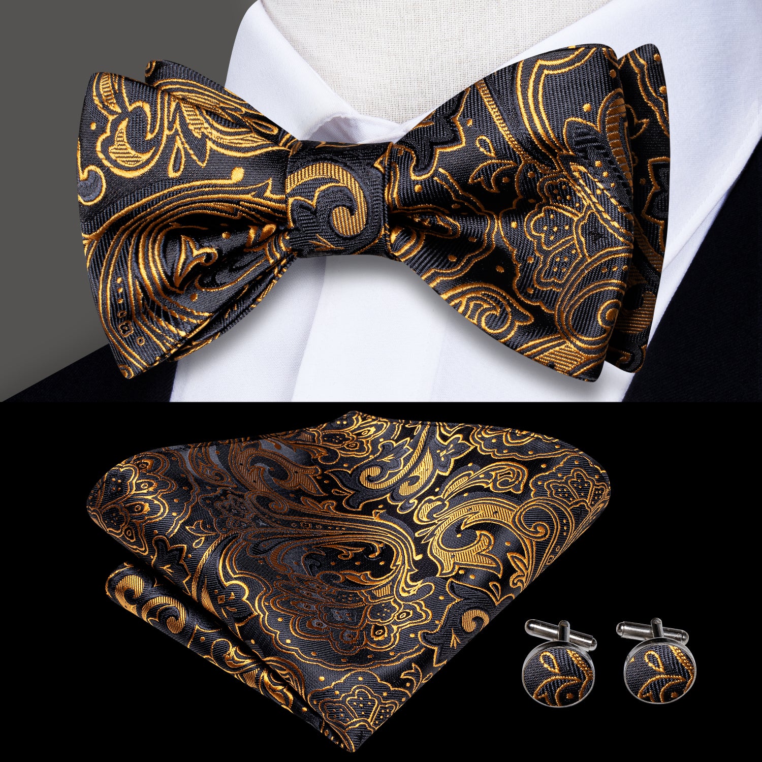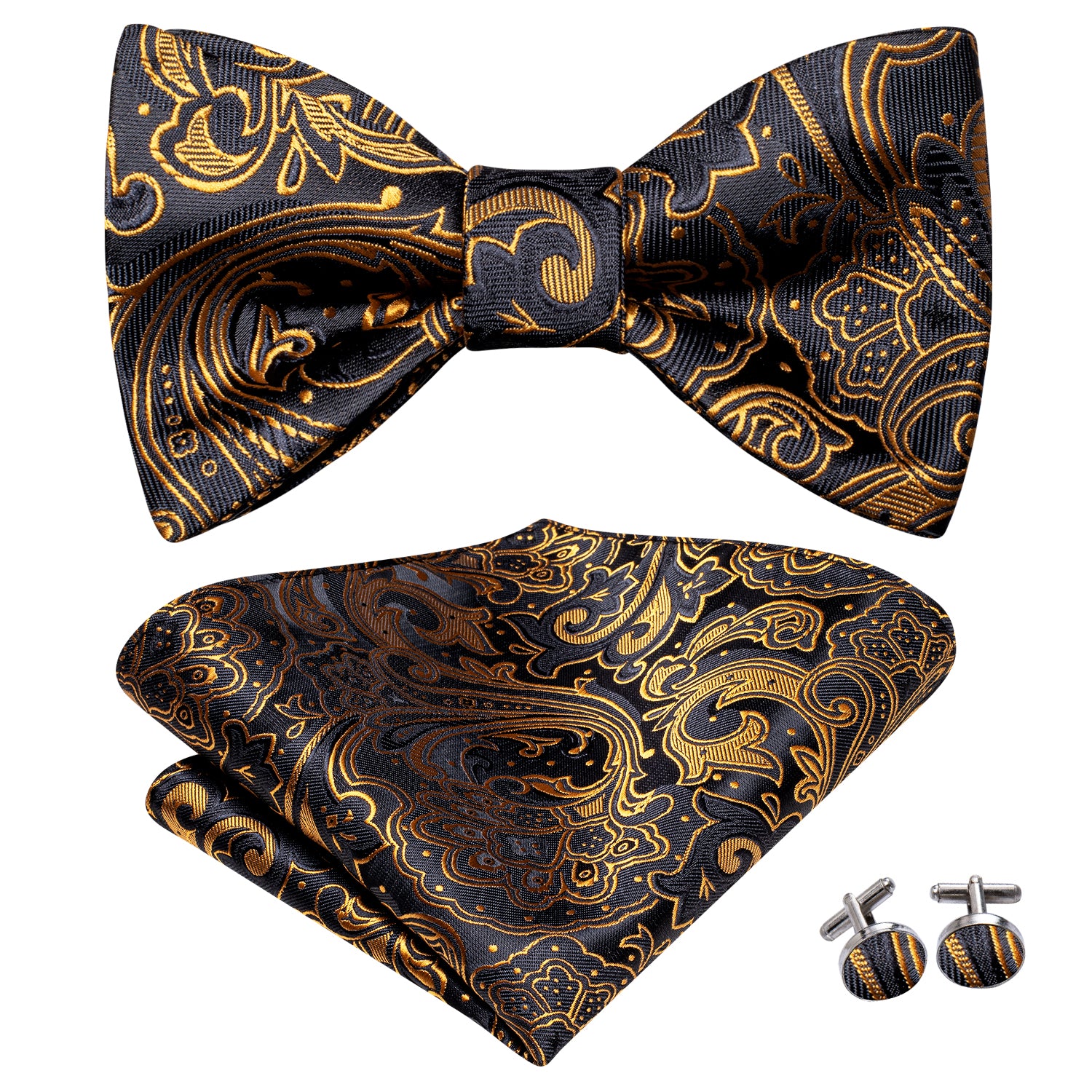 Golden Black Paisley Silk Self-tied Bow Tie Pocket Square Cufflinks Set