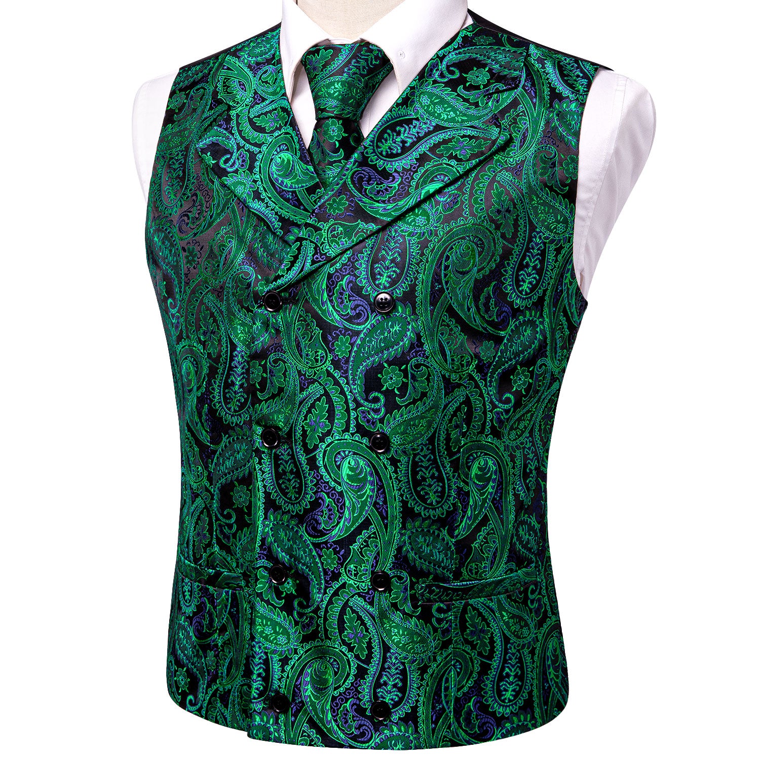 Green Purple Black Paisley Silk Men's Vest Hanky Cufflinks Tie Set Waistcoat Suit Set