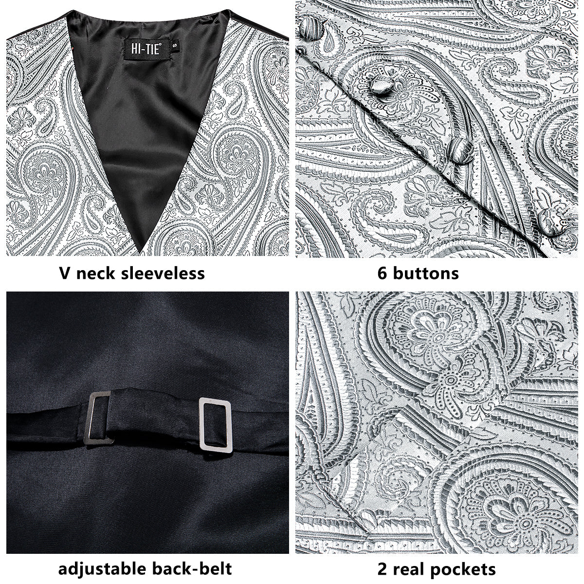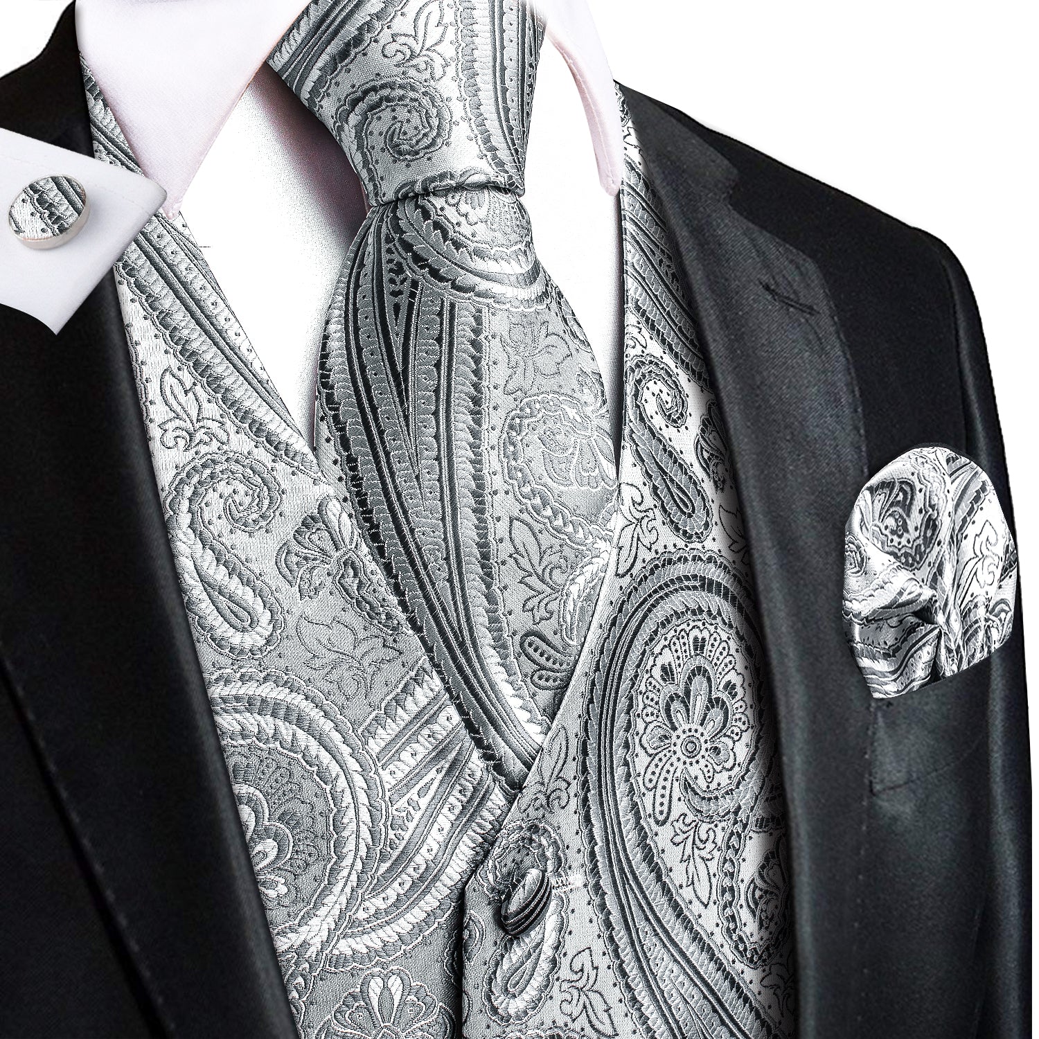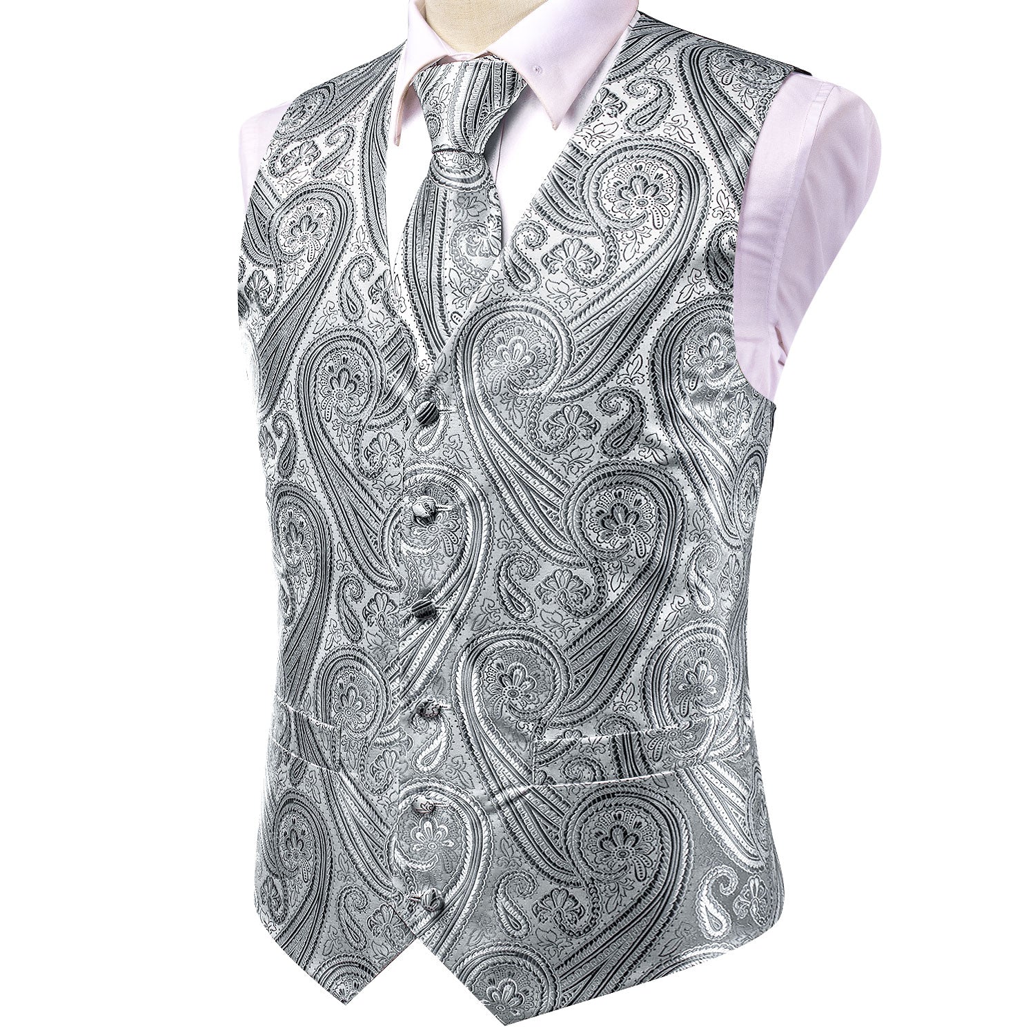 Grey Silver Paisley Silk Men's Vest Hanky Cufflinks Tie Set Waistcoat Suit Set
