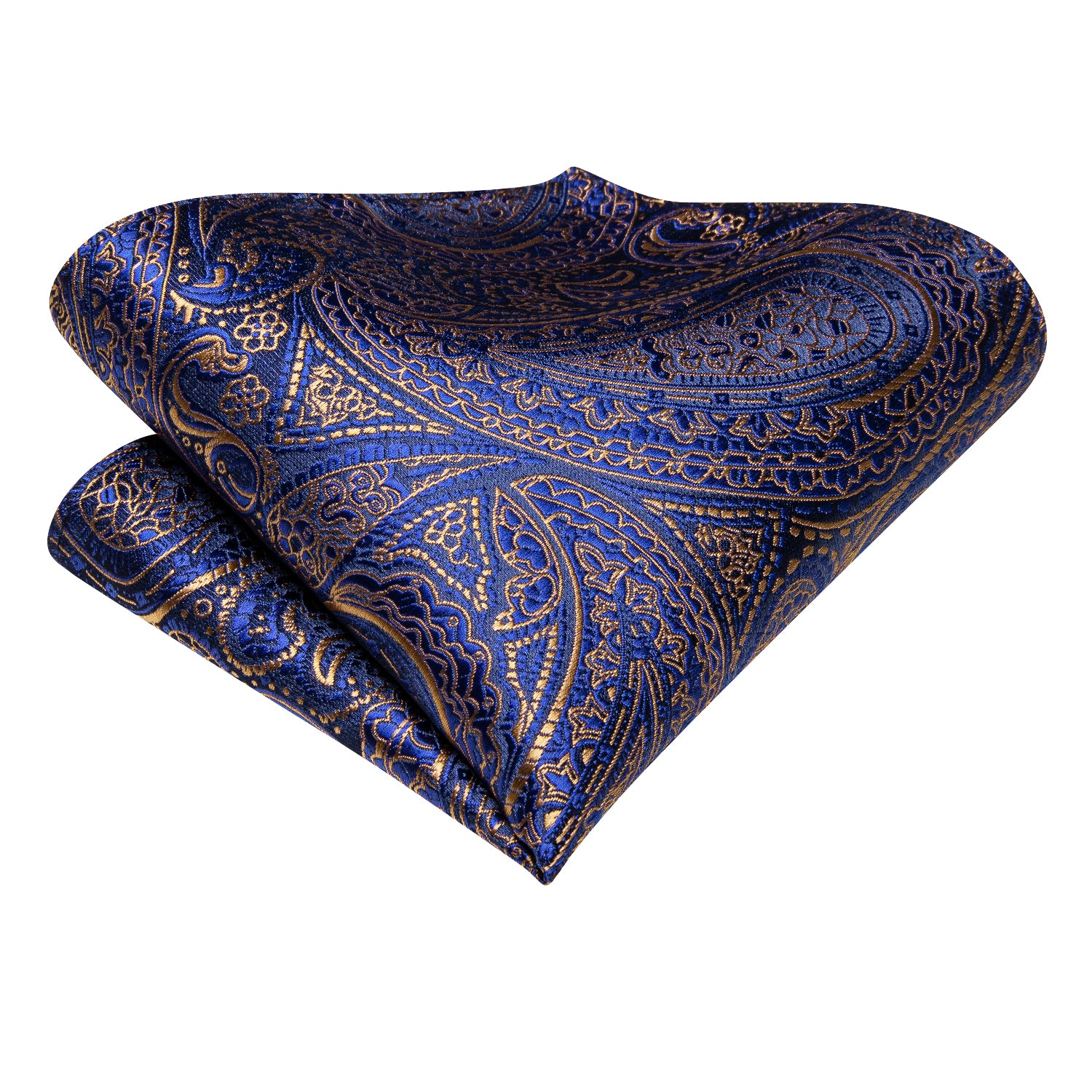 Hi-Tie Royal Blue Golden Paisley Necktie Pocket Square Cufflinks Set