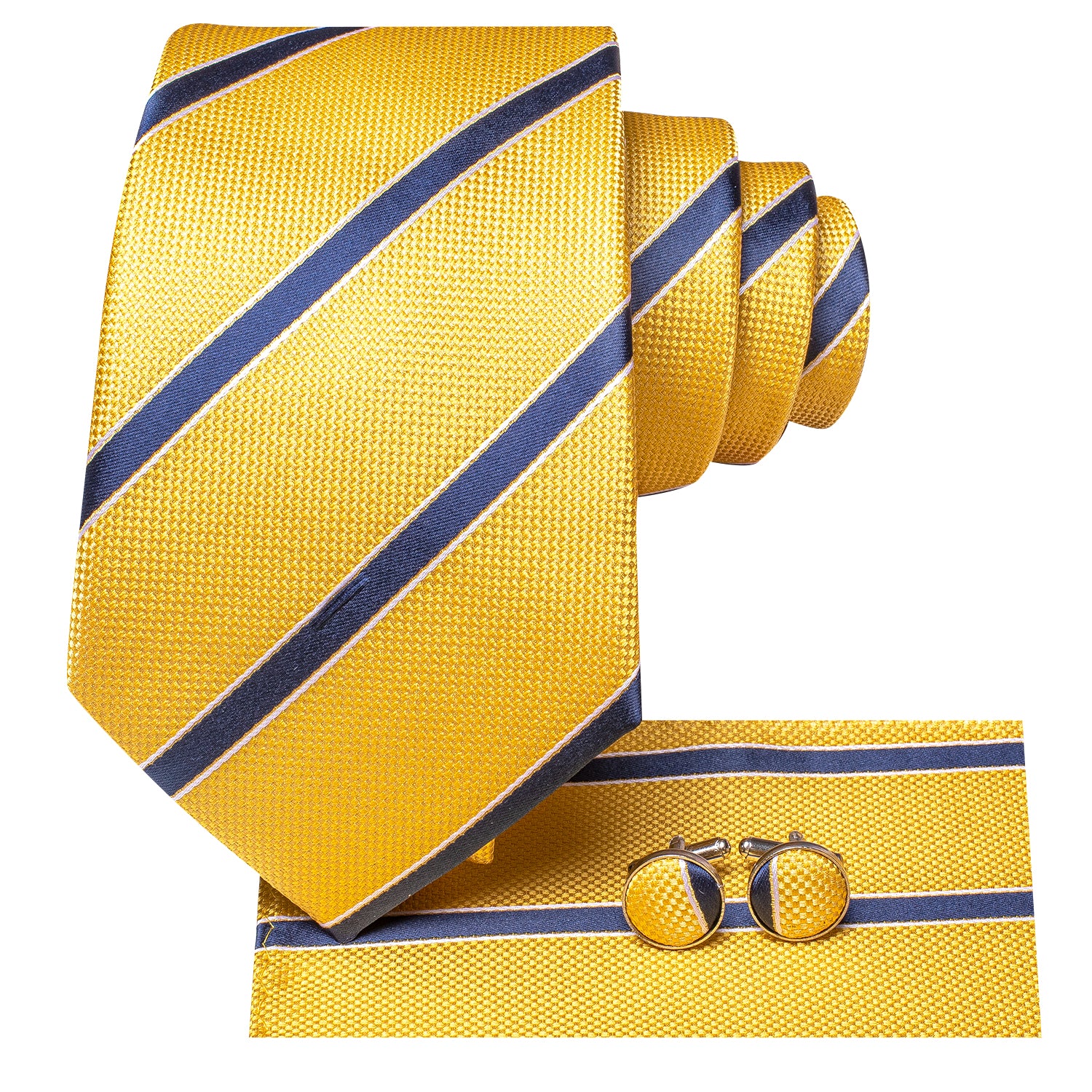 Hi-Tie Yellow Deep Blue Striped Silk Men's Necktie Hanky Cufflinks Set