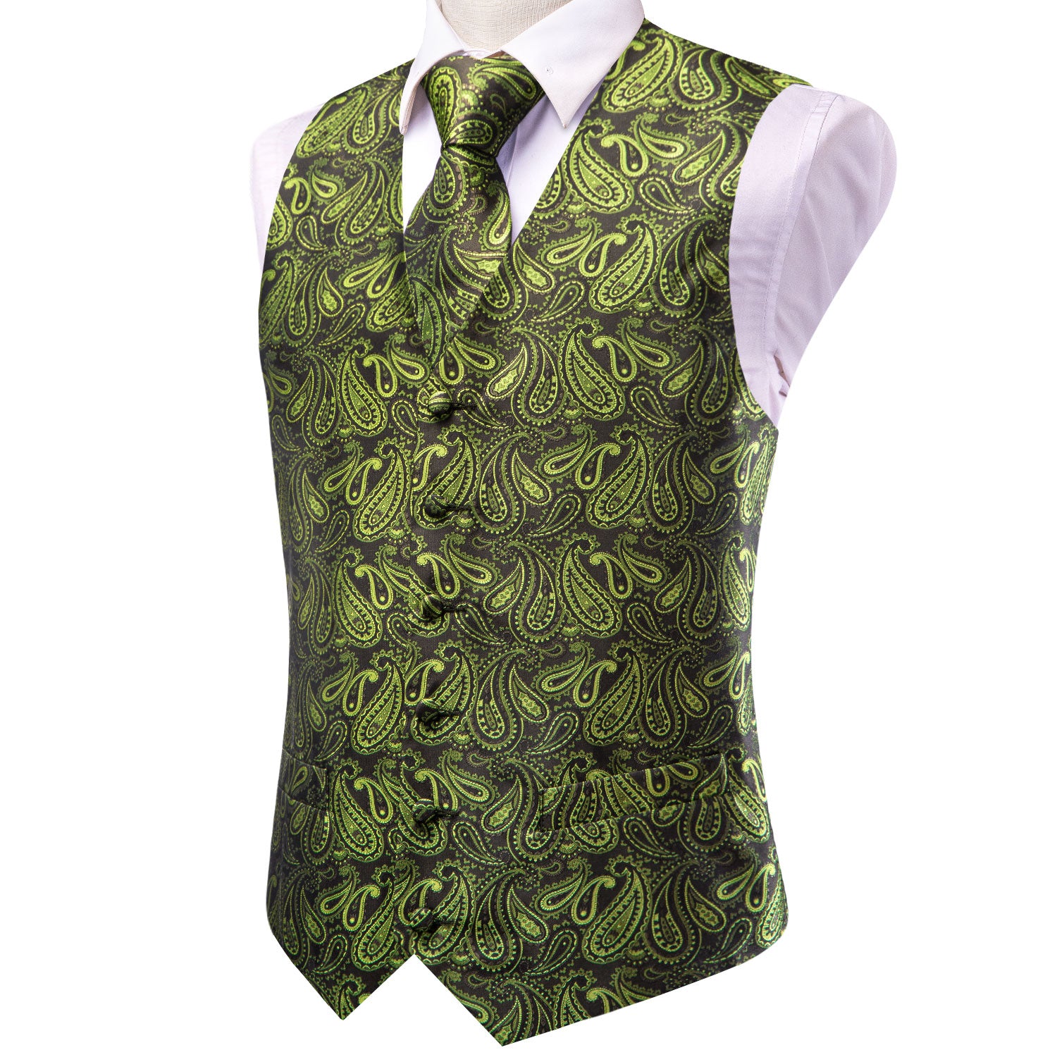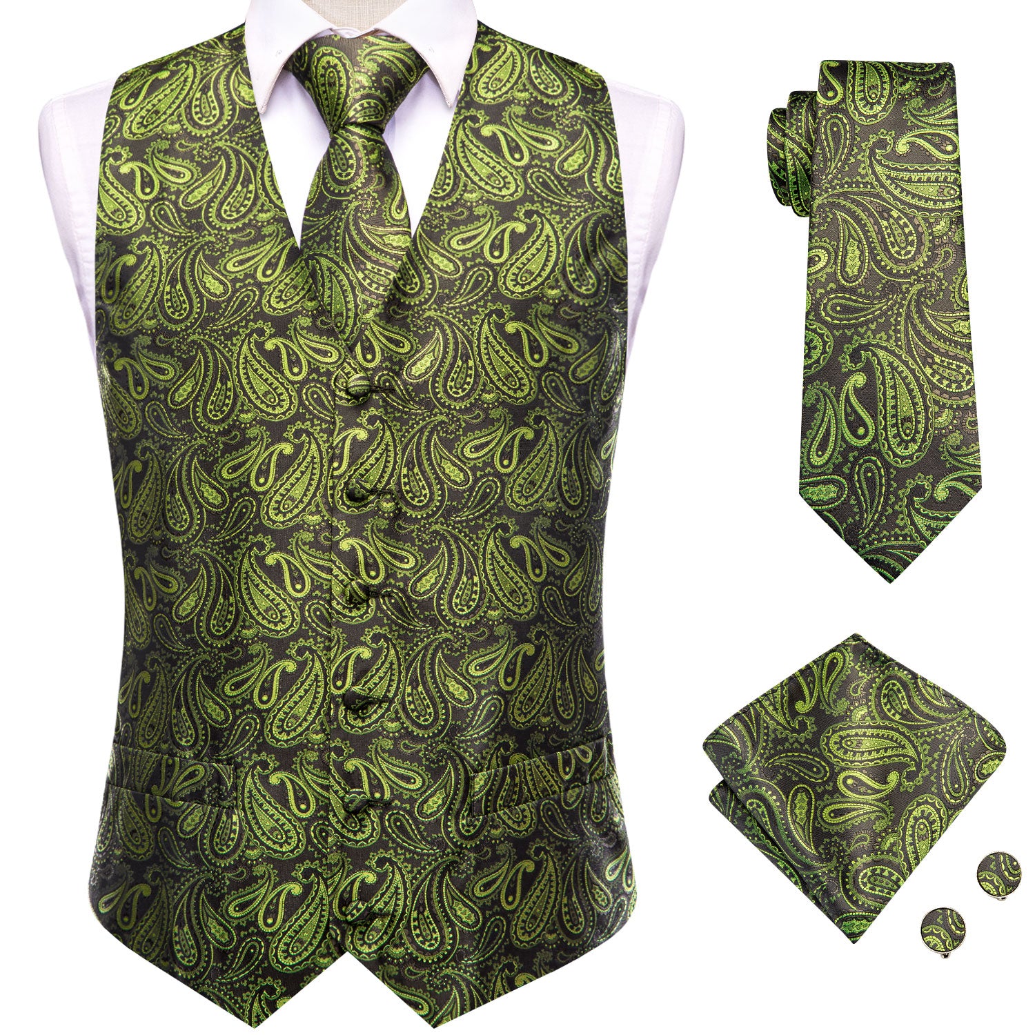 Olive Green Paisley Men's Vest Hanky Cufflinks Tie Set