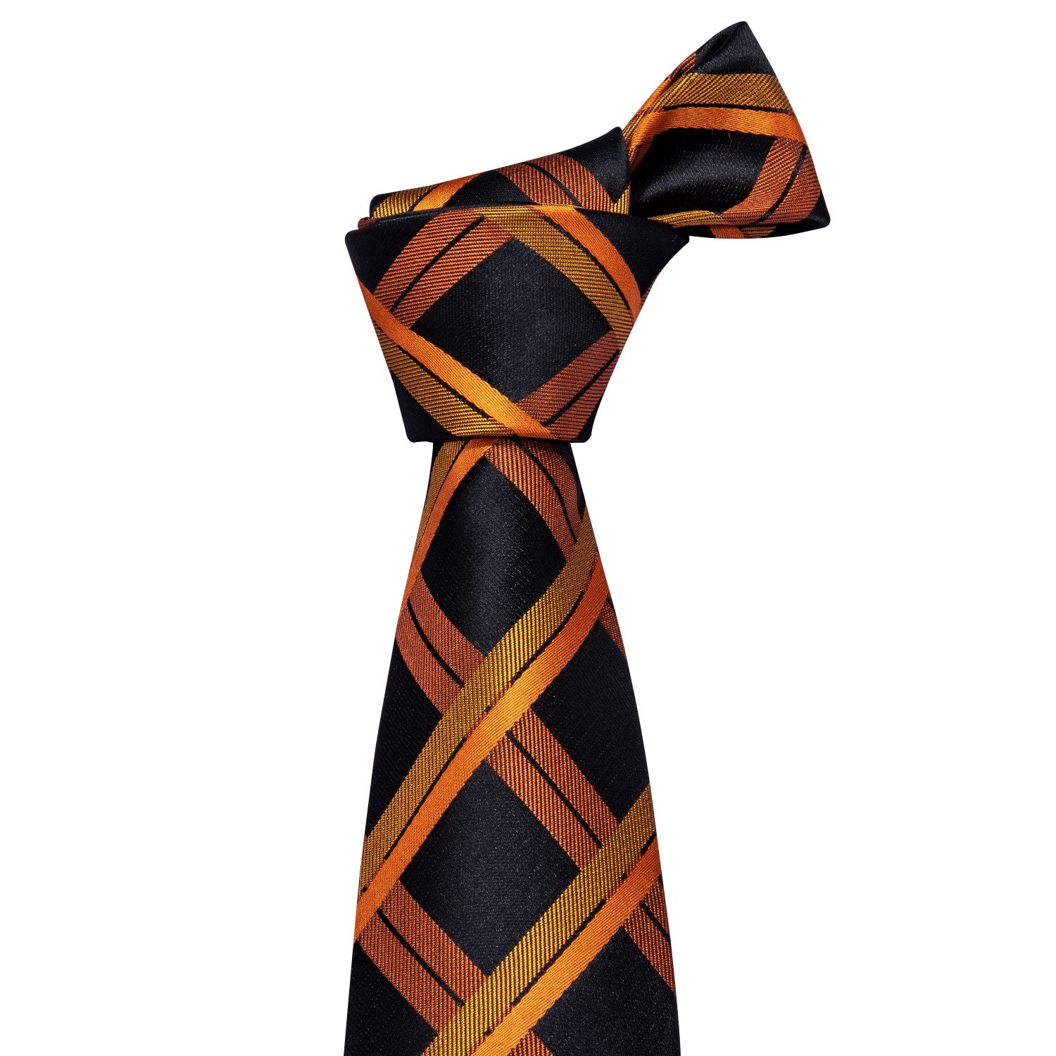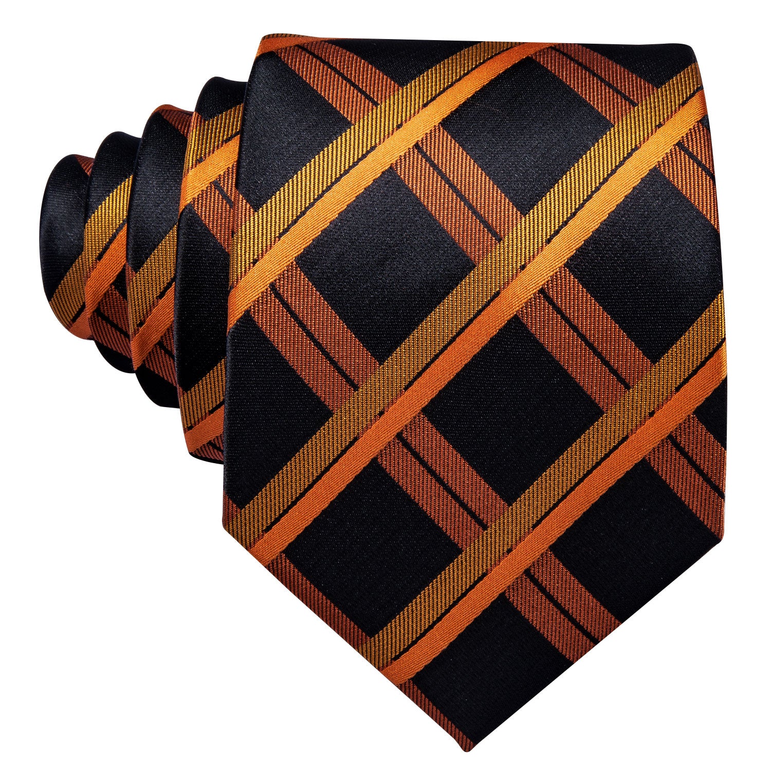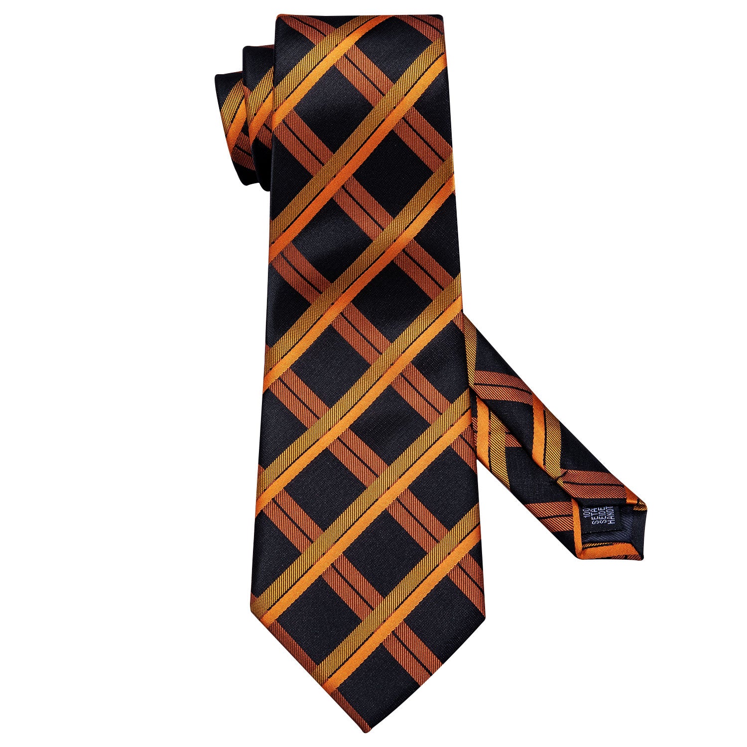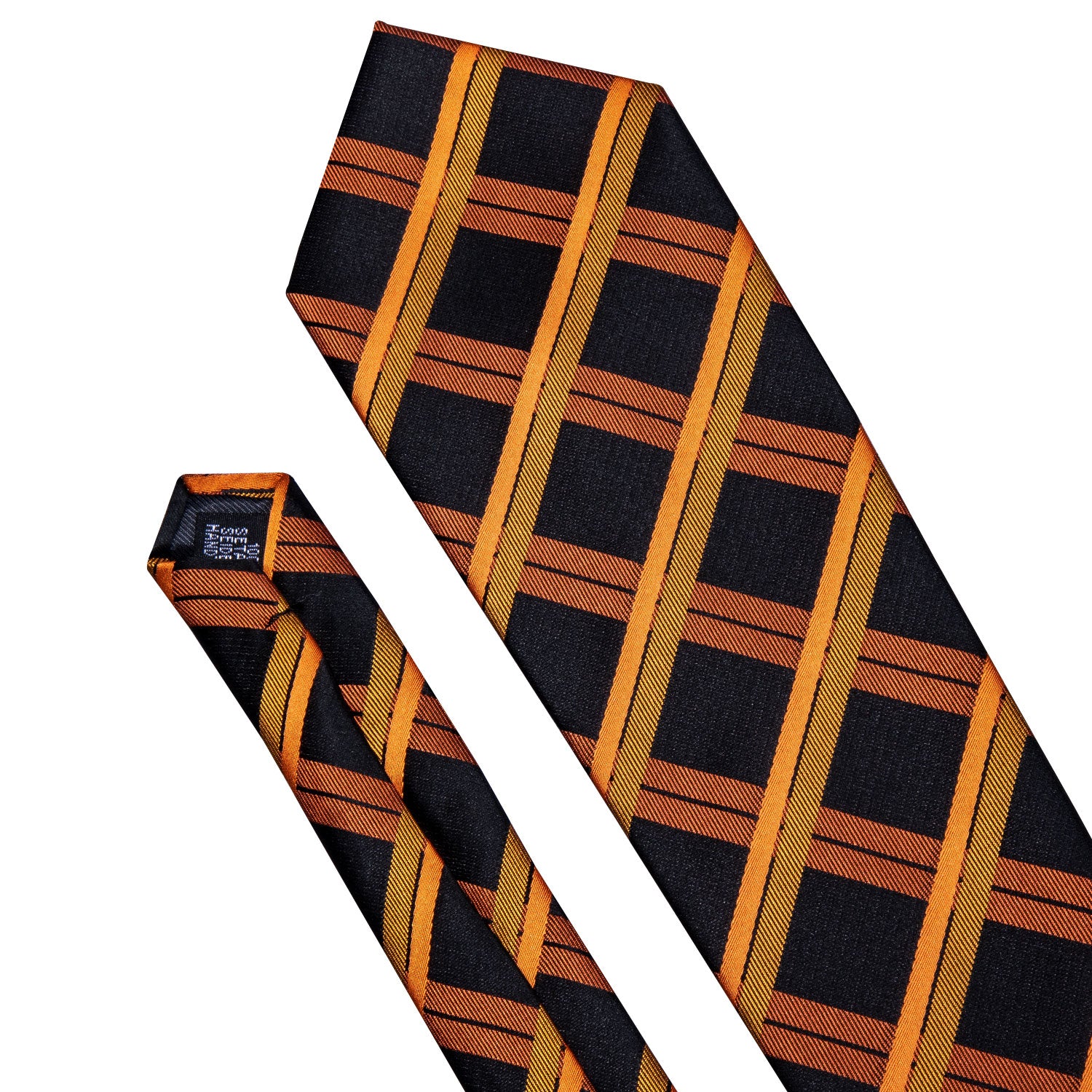 Hi-Tie Black Necktie Orange Plaid Mens Tie Pocket Square Cufflinks Set