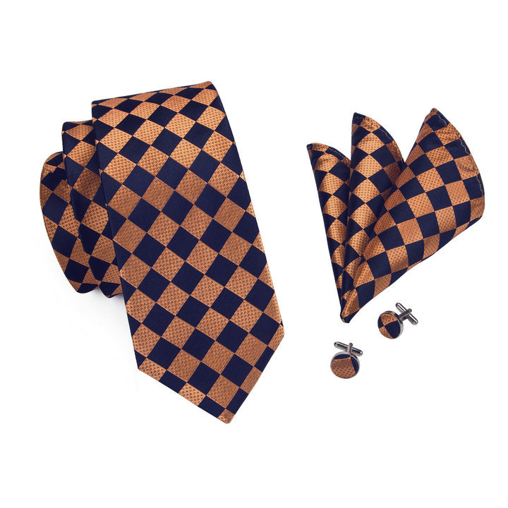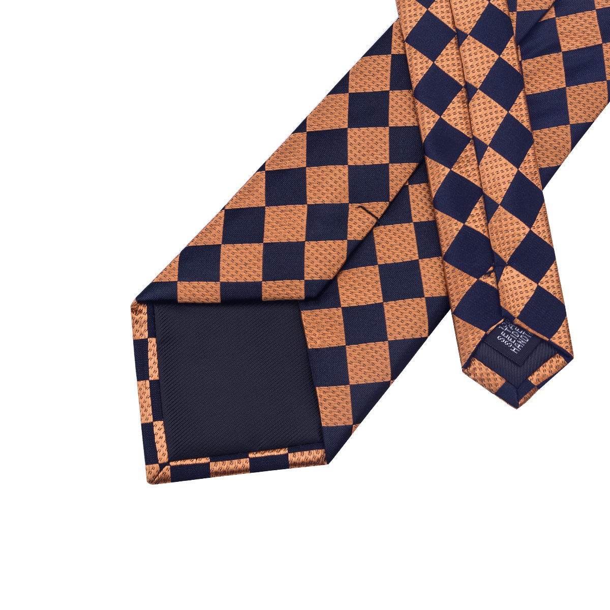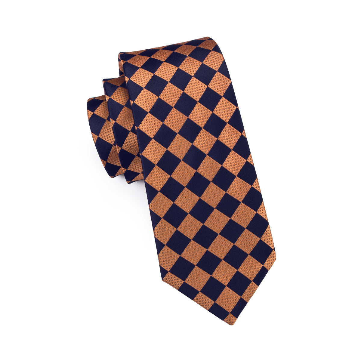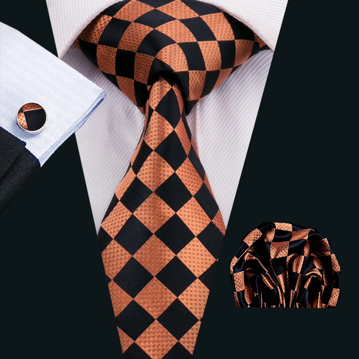 Hi-Tie Mens Orange Black Checkered Necktie Pocket Square Cufflinks Set
