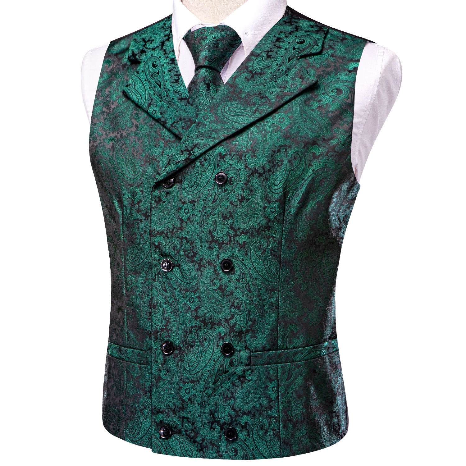 Pine Green Paisley Men's Collar Vest Hanky Cufflinks Tie Set