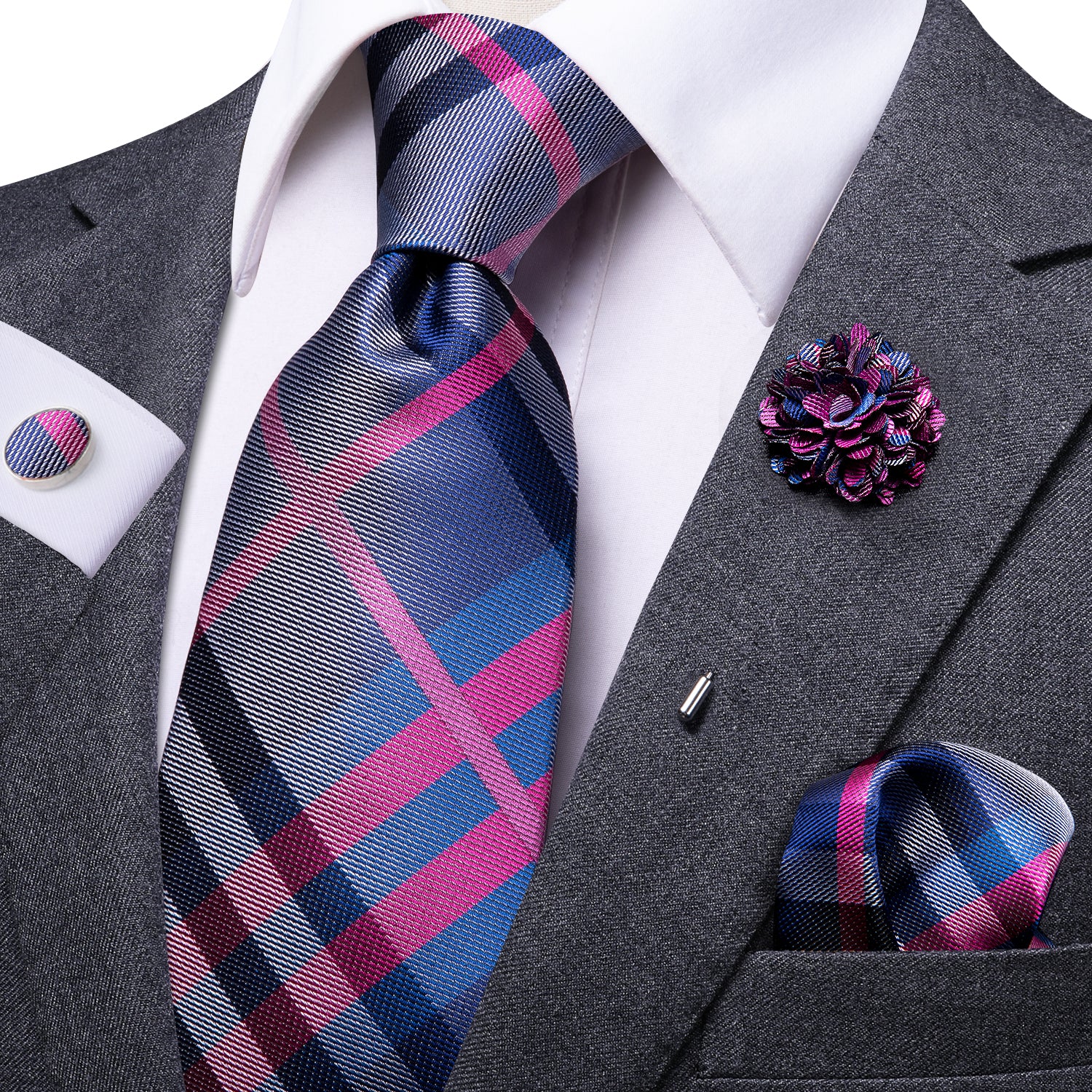 Pink Blue Grey Plaid Tie Pocket Square Cufflinks Set with Brooch
