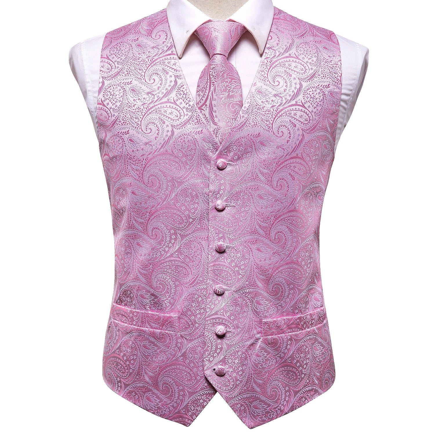 Pink Paisley Silk Men's Vest Hanky Cufflinks Tie Set Waistcoat Suit Set