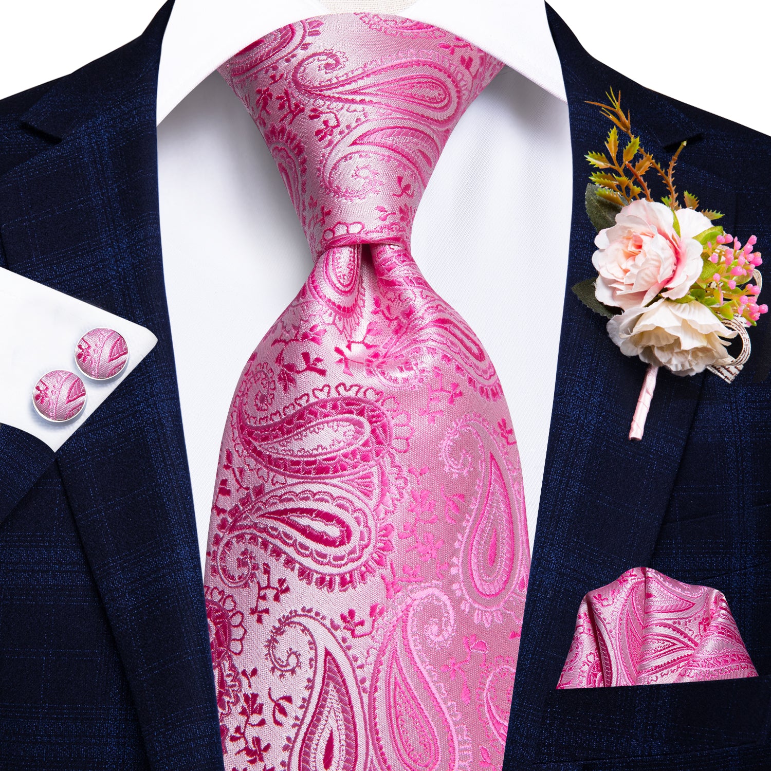 Pink Paisley Tie Handkerchief Cufflinks Set with Wedding Brooch