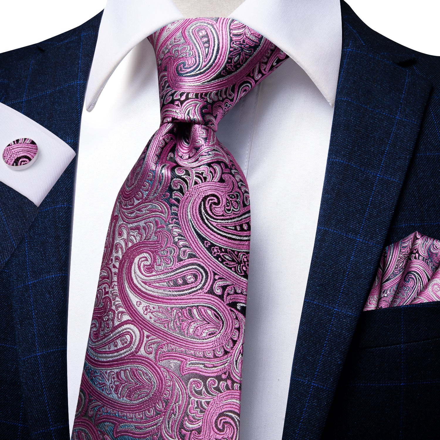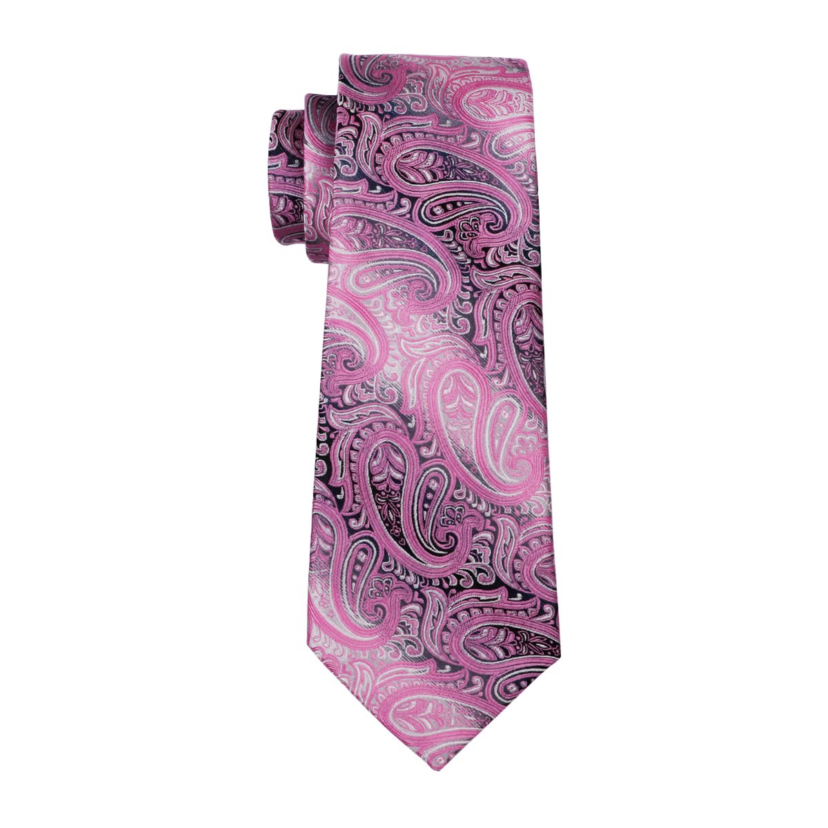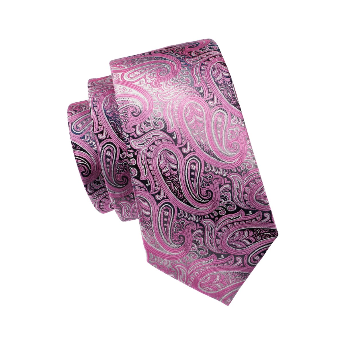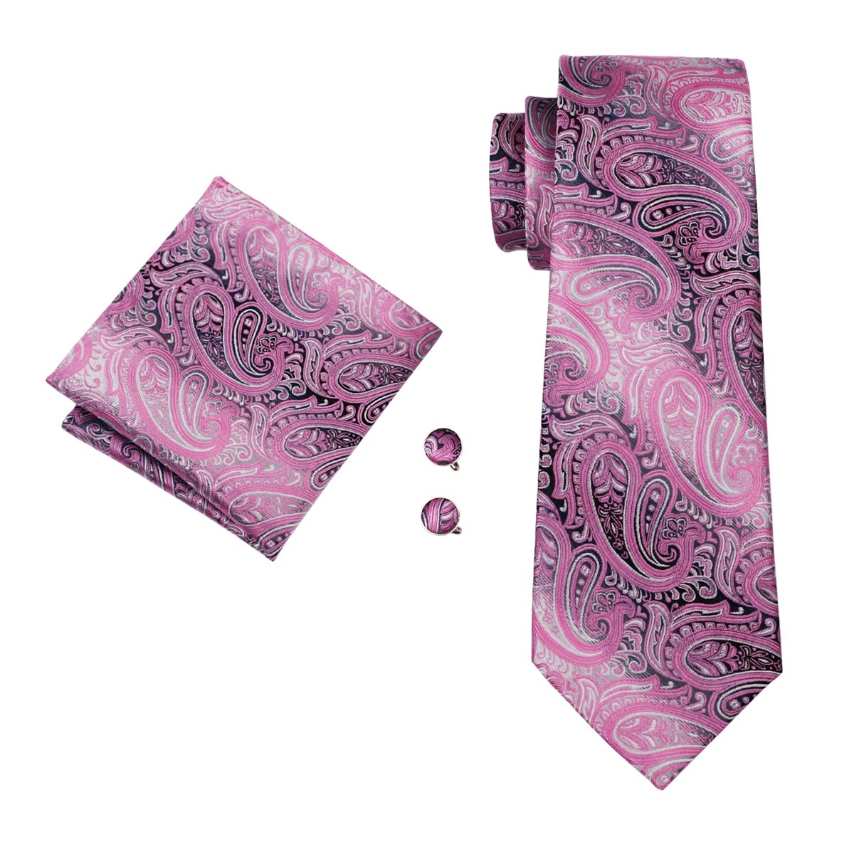 Hi-Tie Men's Pink Paisley Tie Pocket Square Cufflinks Set with Brooch