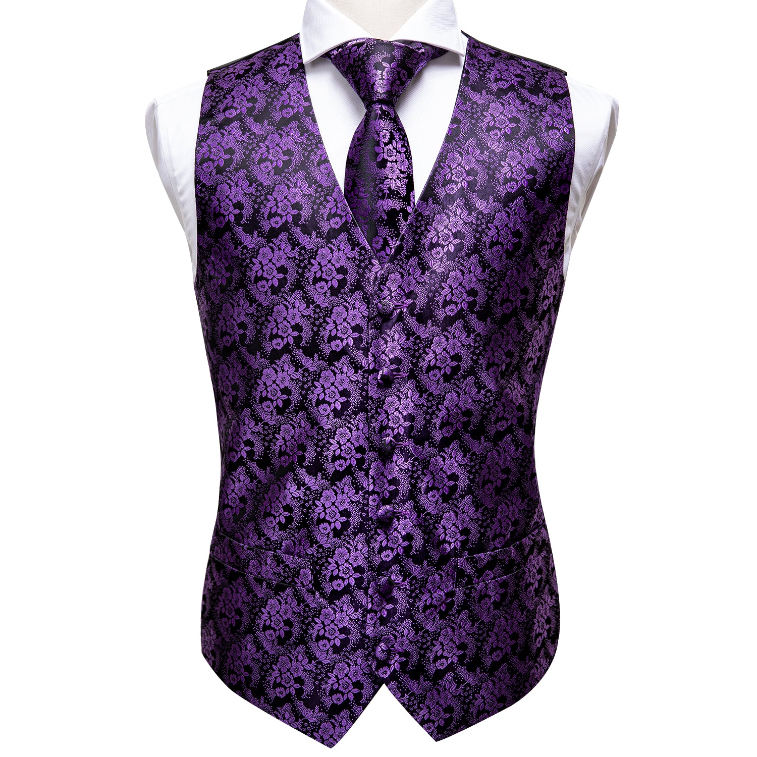 Purple Black Floral Silk Men's Vest Hanky Cufflinks Tie Set Waistcoat Suit Set