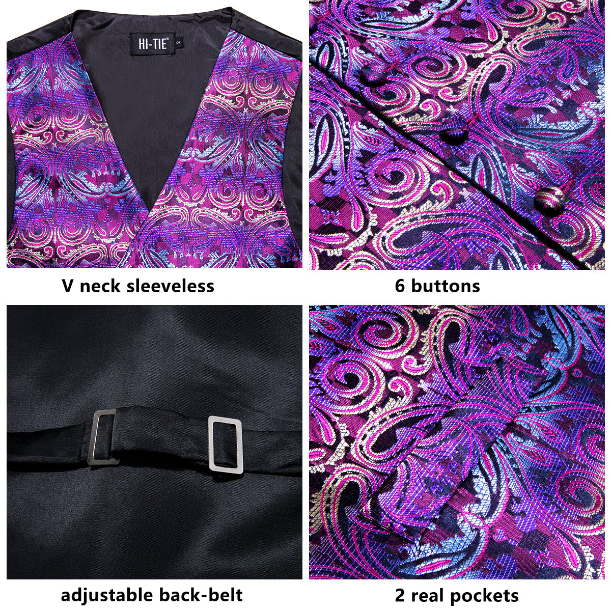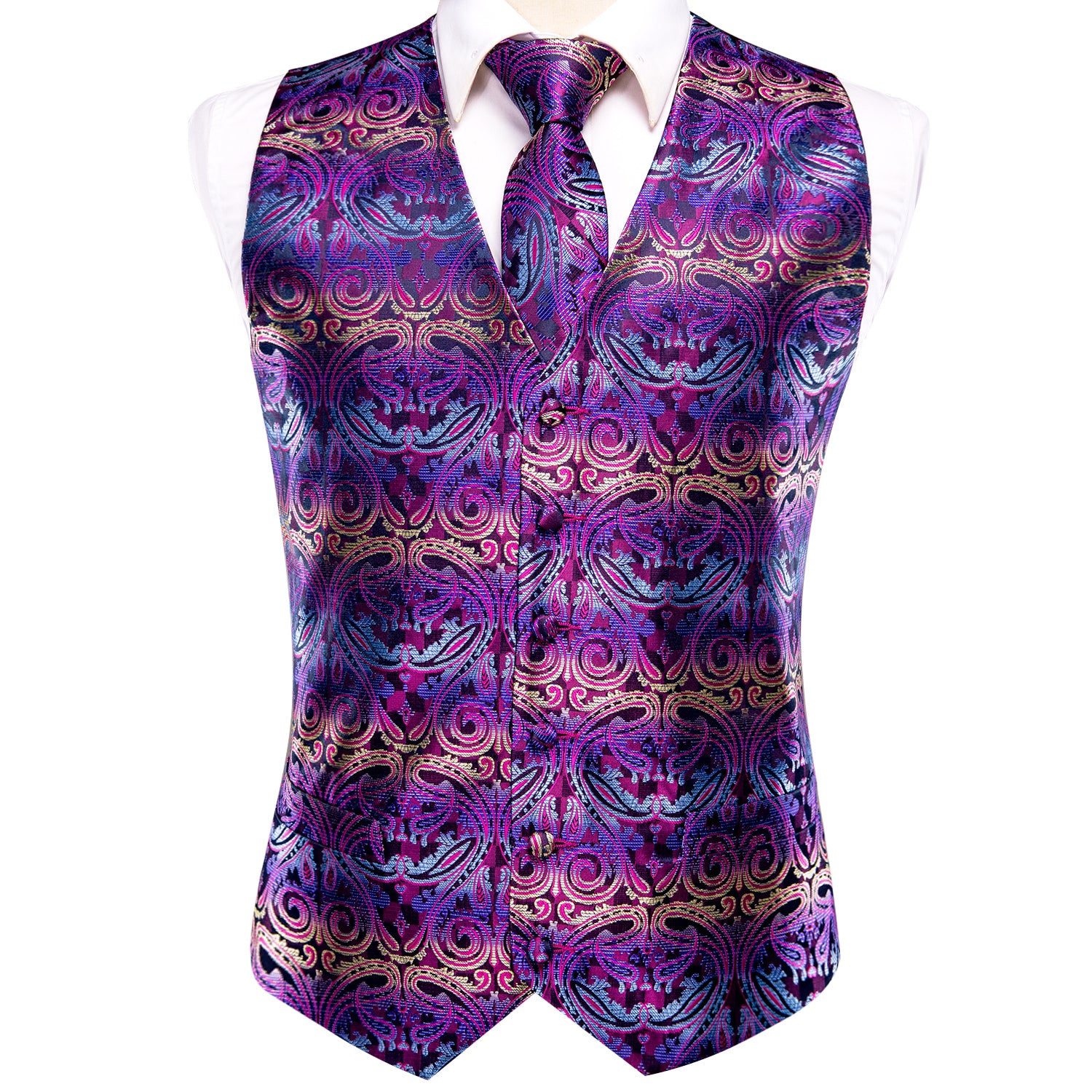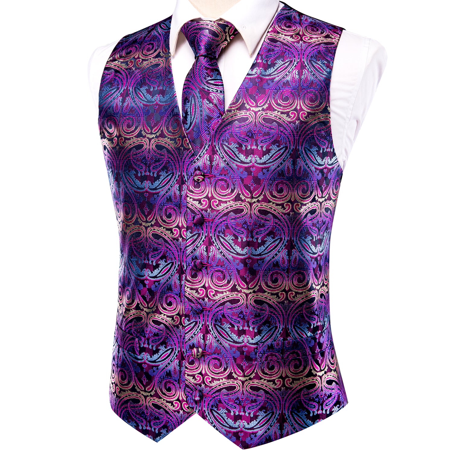 Purple Paisley Novelty Silk Men's Vest Hanky Cufflinks Tie Set Waistcoat Suit Set