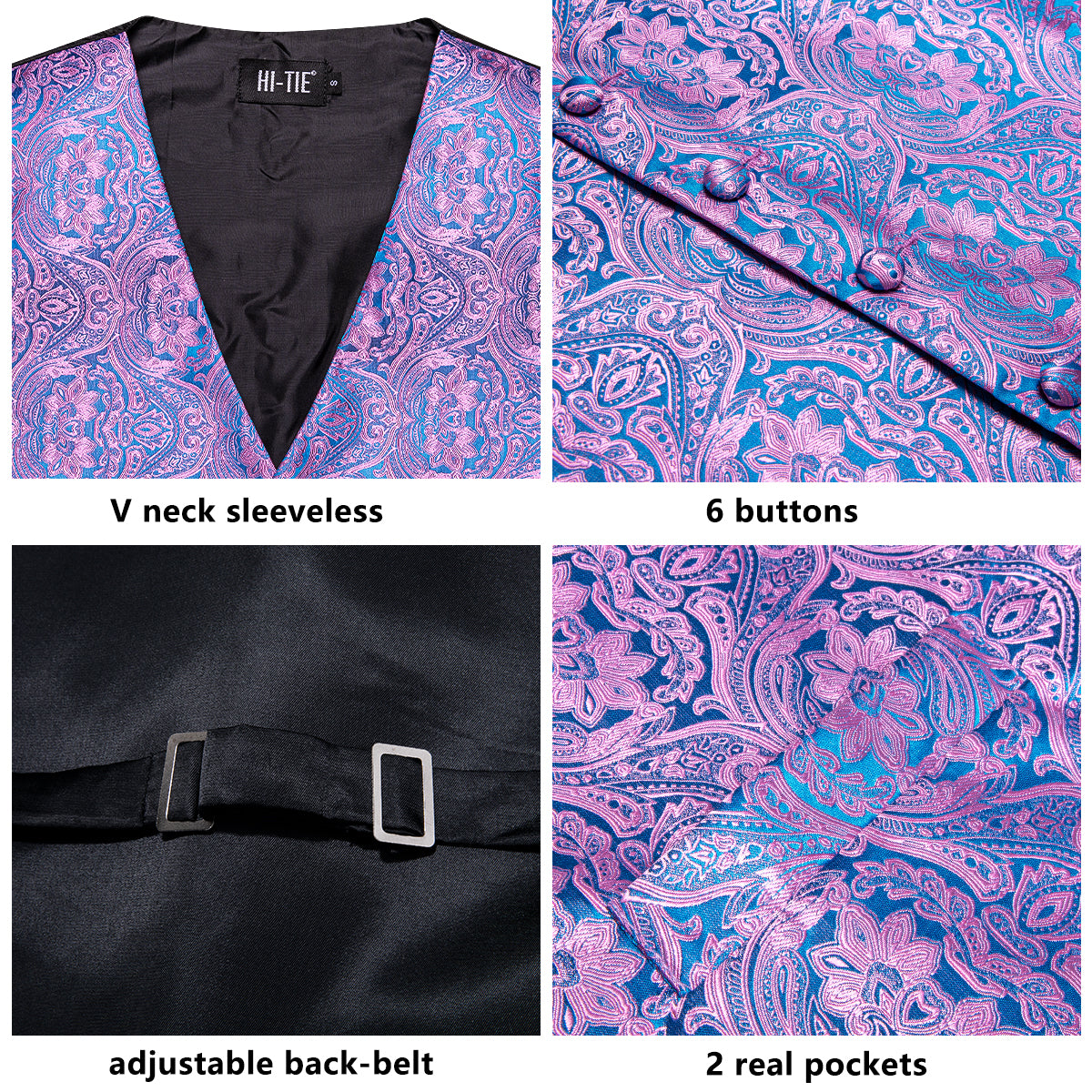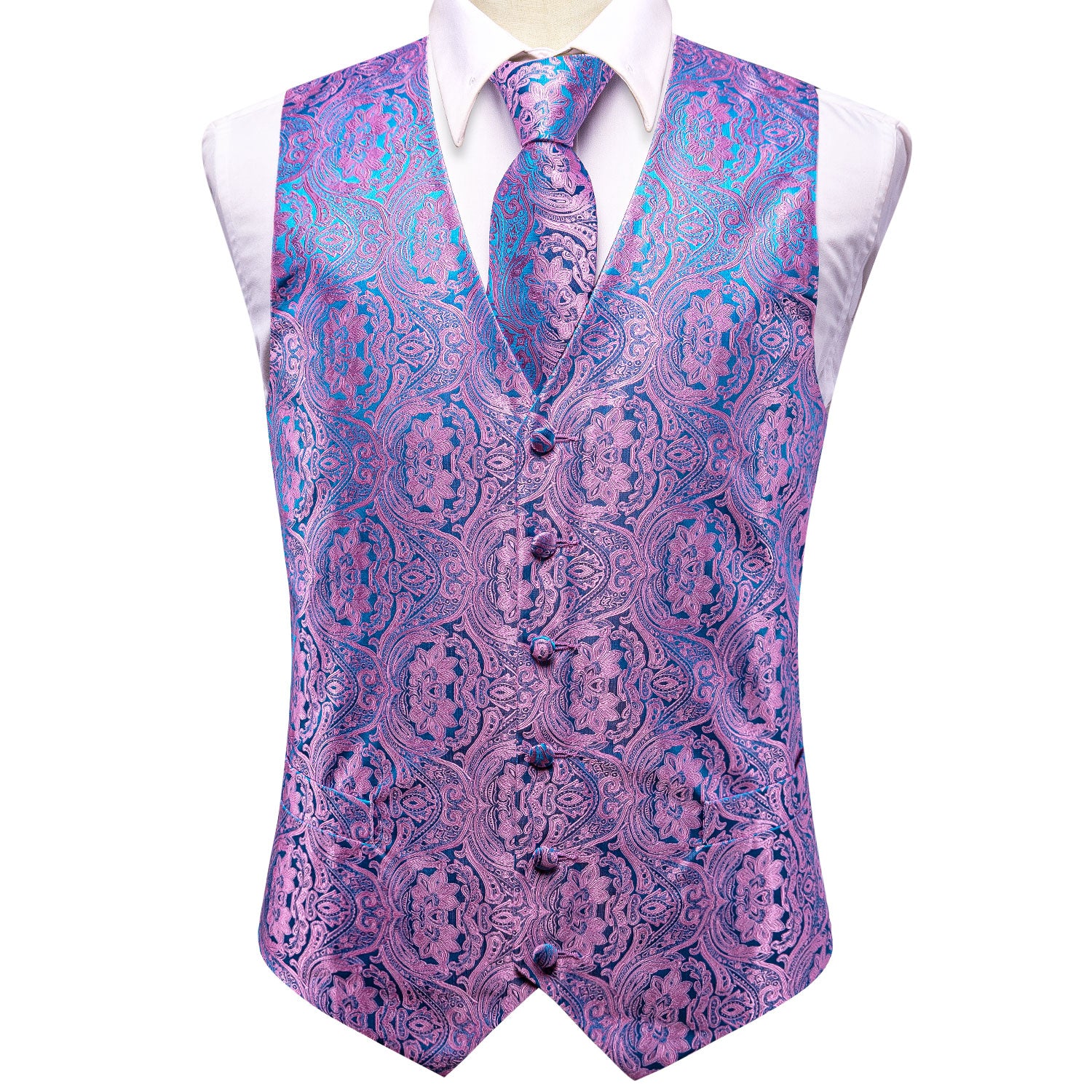 Shiny Pink Blue Paisley Silk Men's Vest Hanky Cufflinks Tie Set Waistcoat Suit Set