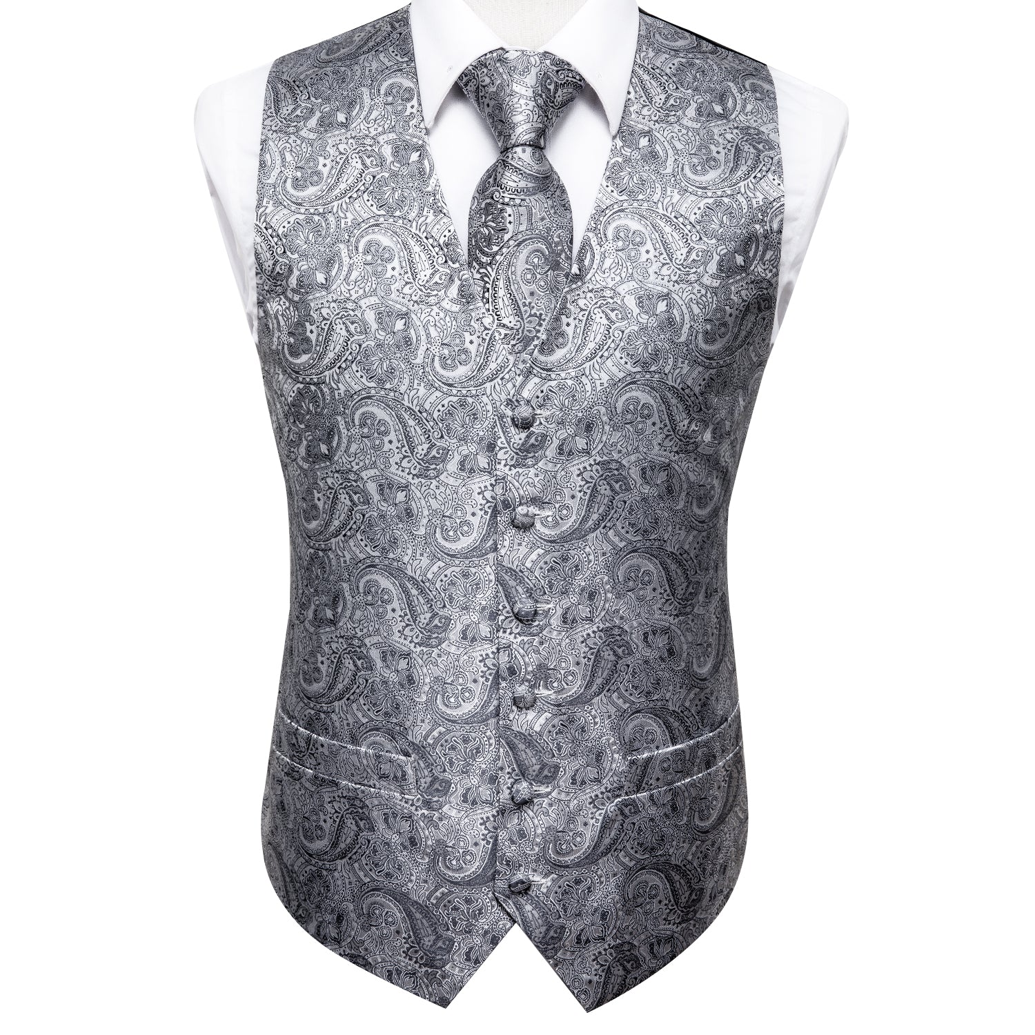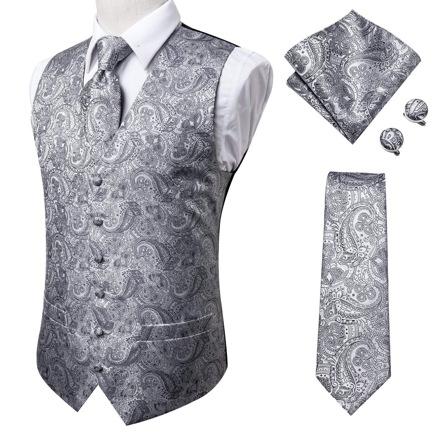 Silver Grey Paisley Silk Men's Vest Hanky Cufflinks Tie Set Waistcoat Suit Set