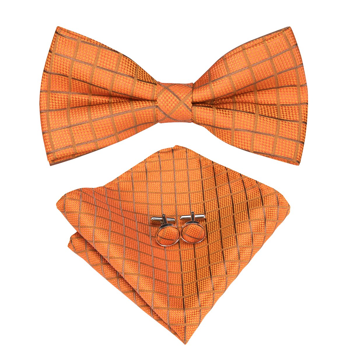 Silver Orange Plaid Pre-tied Bow Tie Hanky Cufflinks Pin Set