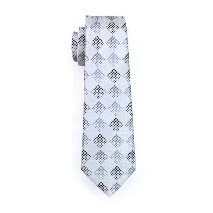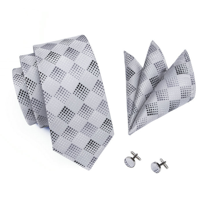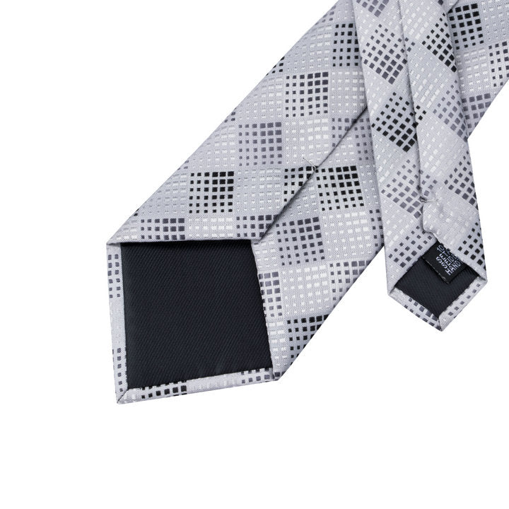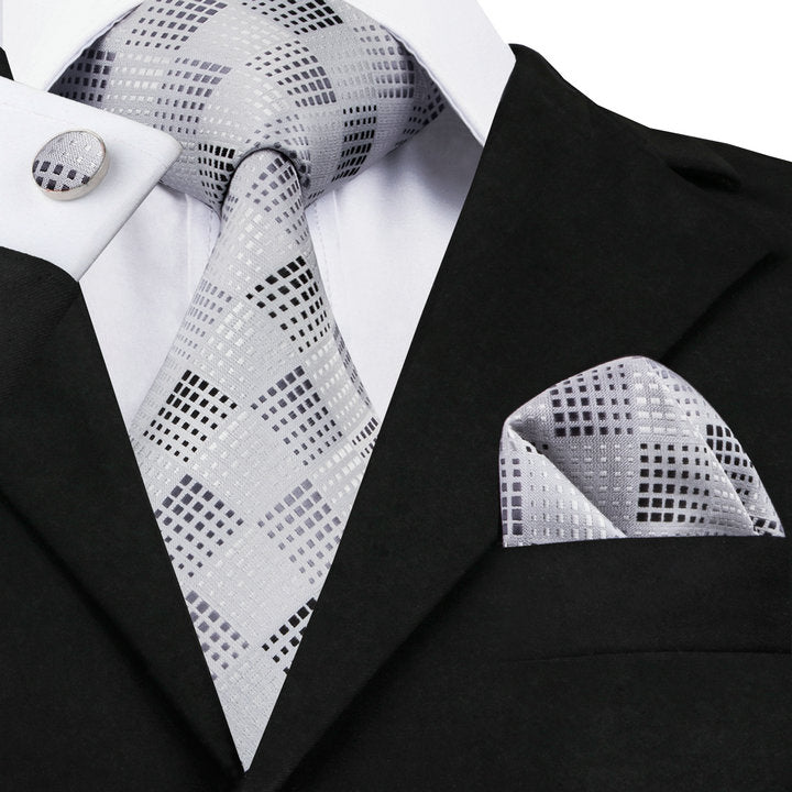Hi-Tie Silver White Plaid Silk Men's Tie Pocket Square Cufflinks Set