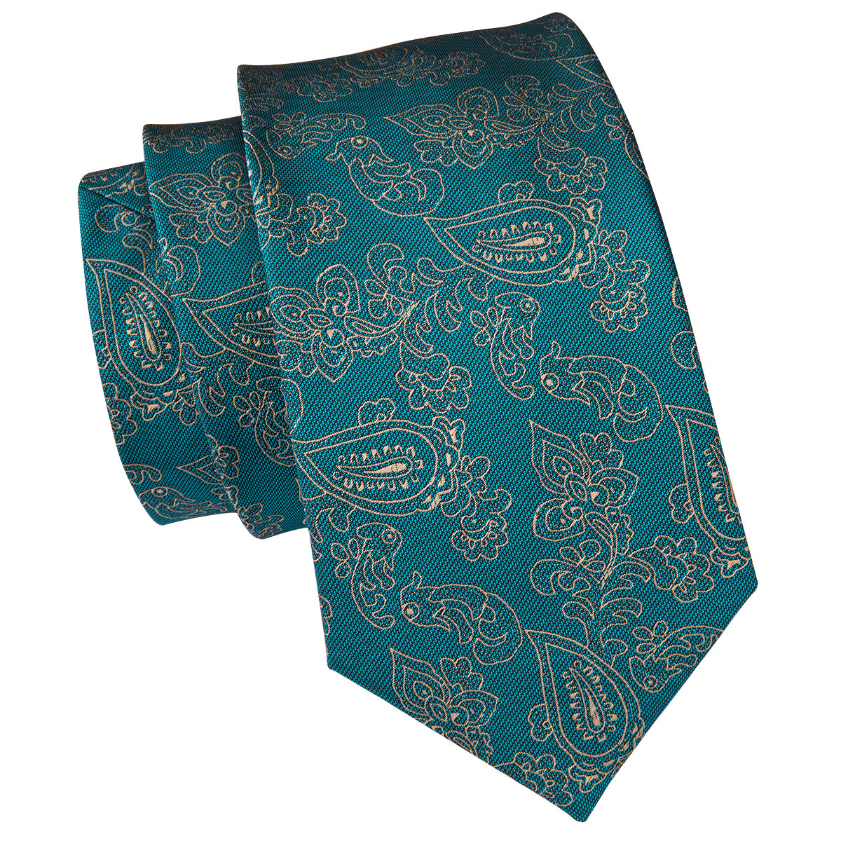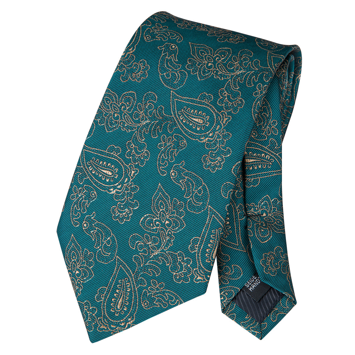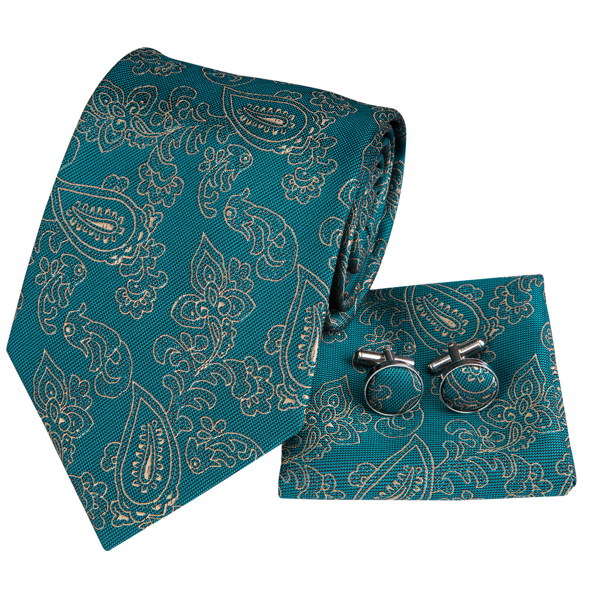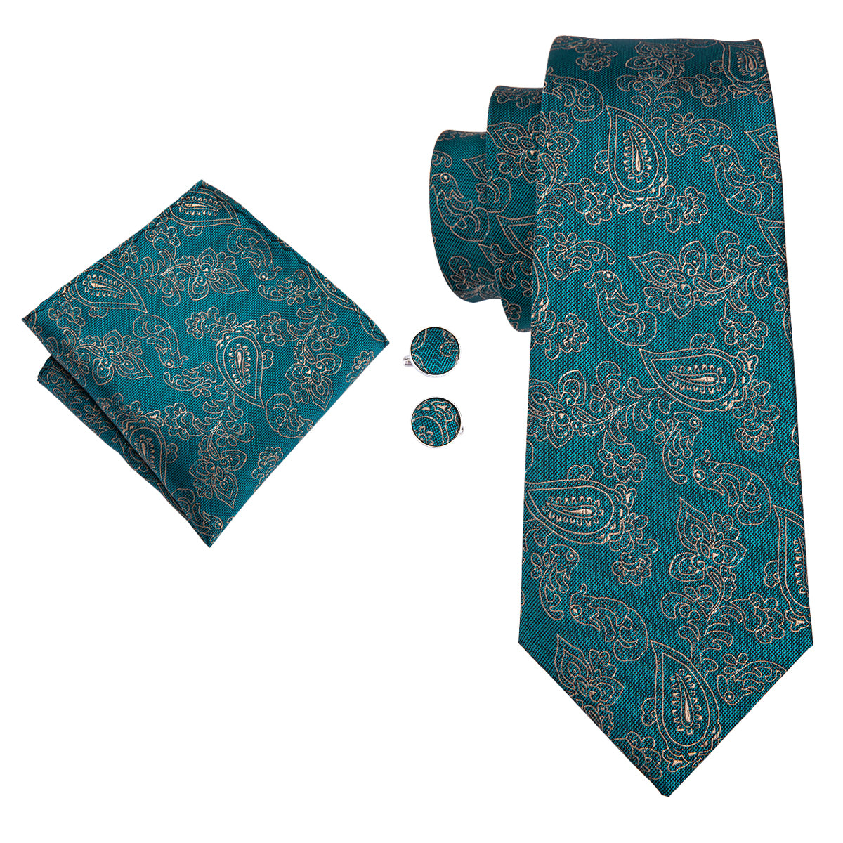 Hi-Tie Teal Green Tie Gold LIne floral Tie Pocket Square Cufflinks Set