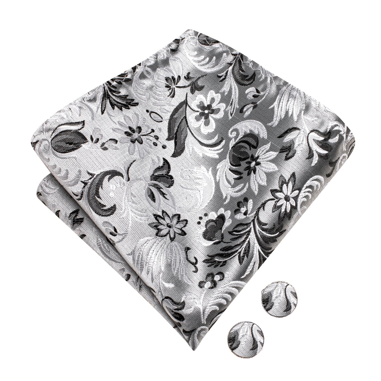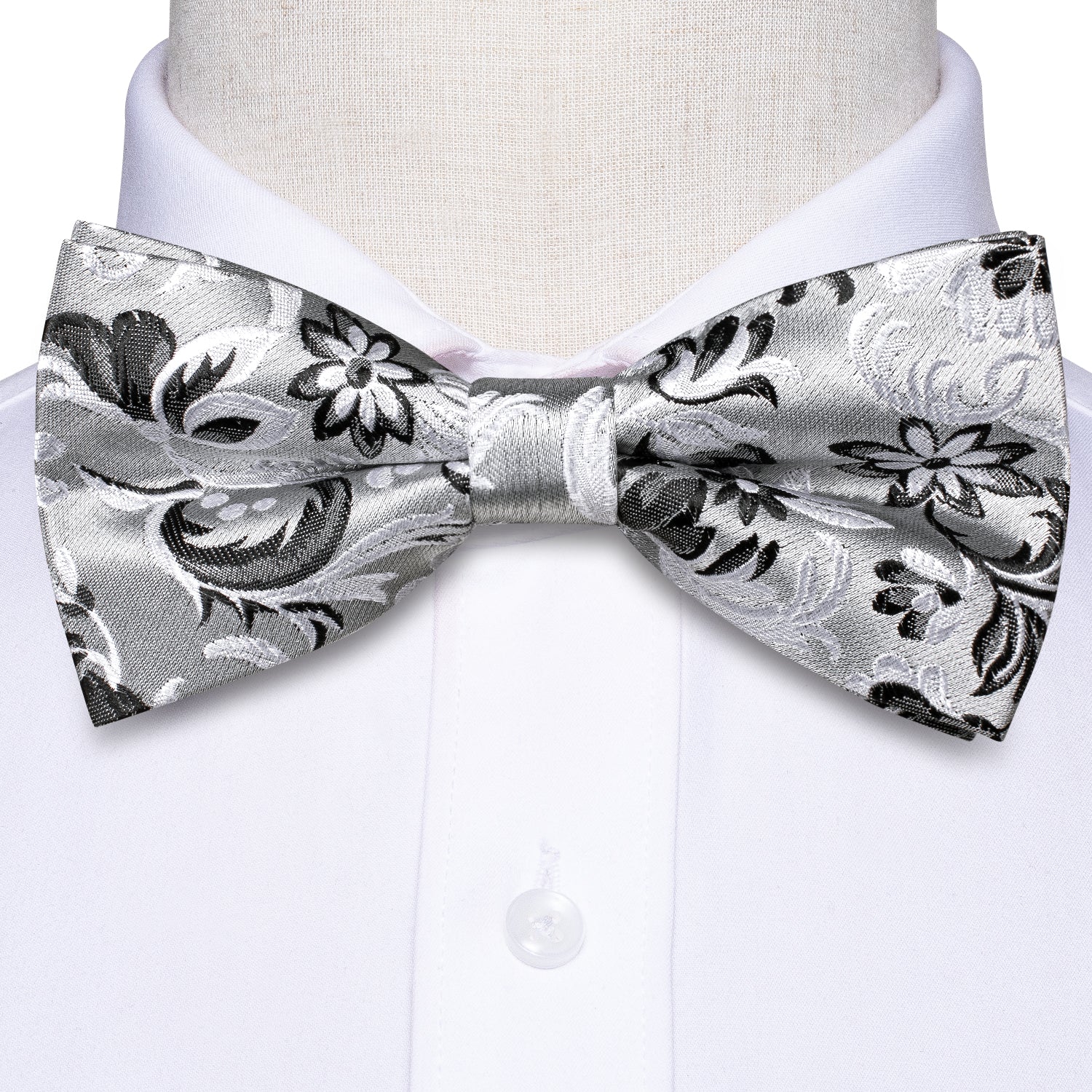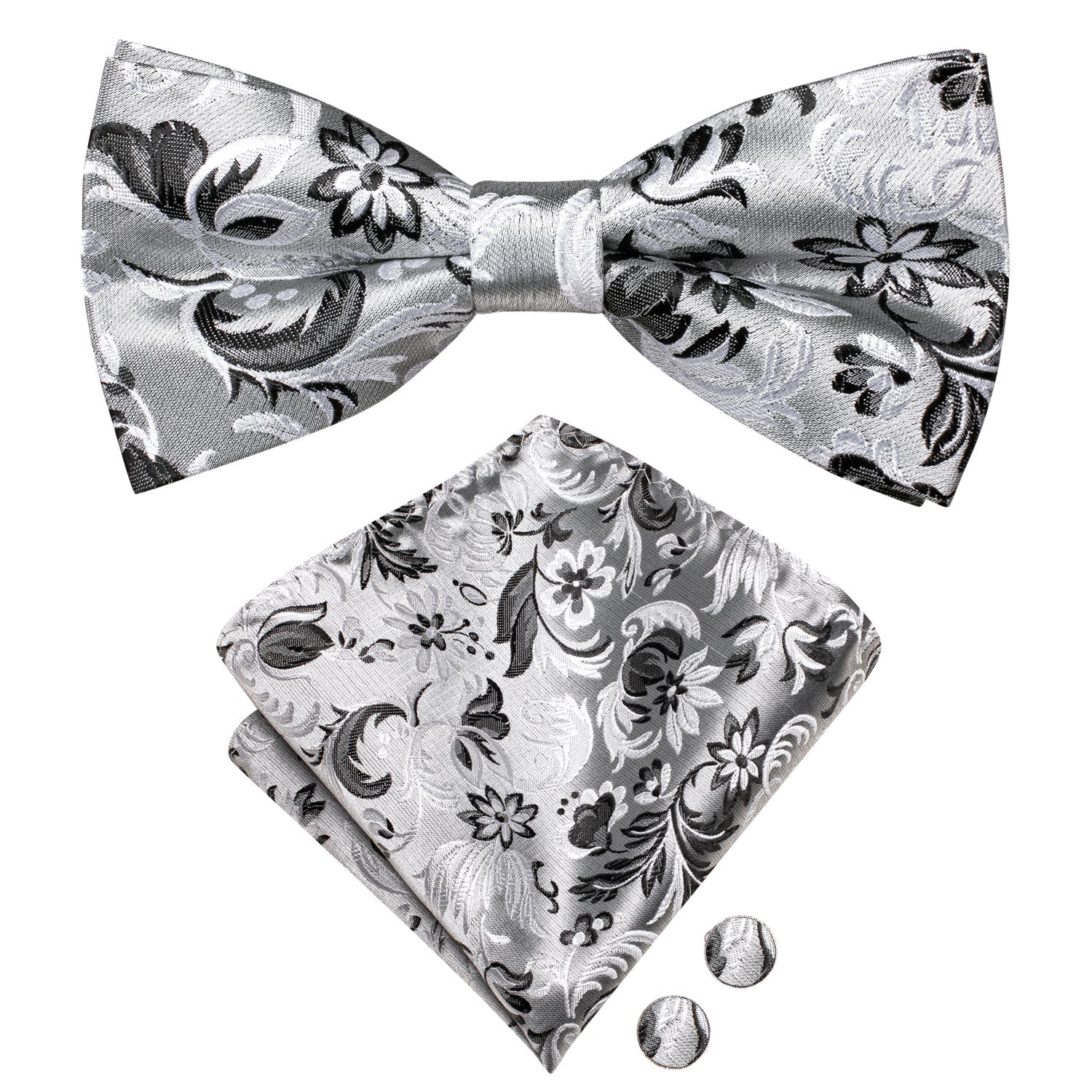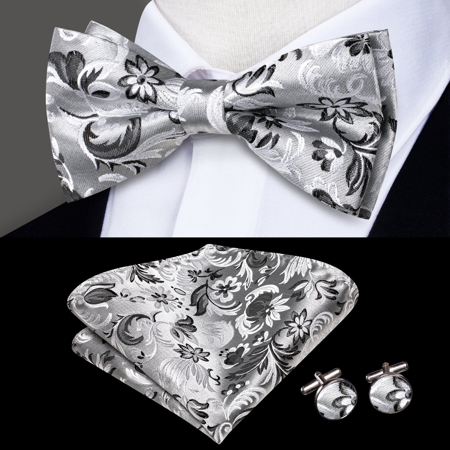 White Grey Floral Silk Pre-tied Bow Tie Hanky Cufflinks Set