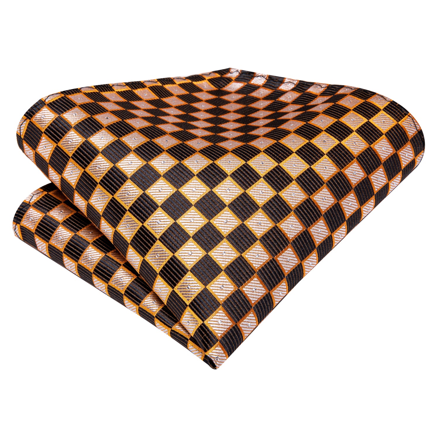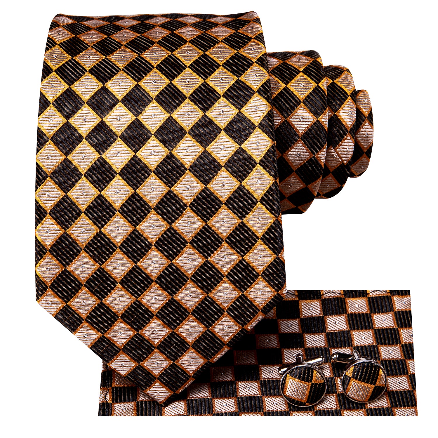 Hi-Tie Necktie Yellow Brown Plaid Mens Tie Pocket Square Cufflinks Set